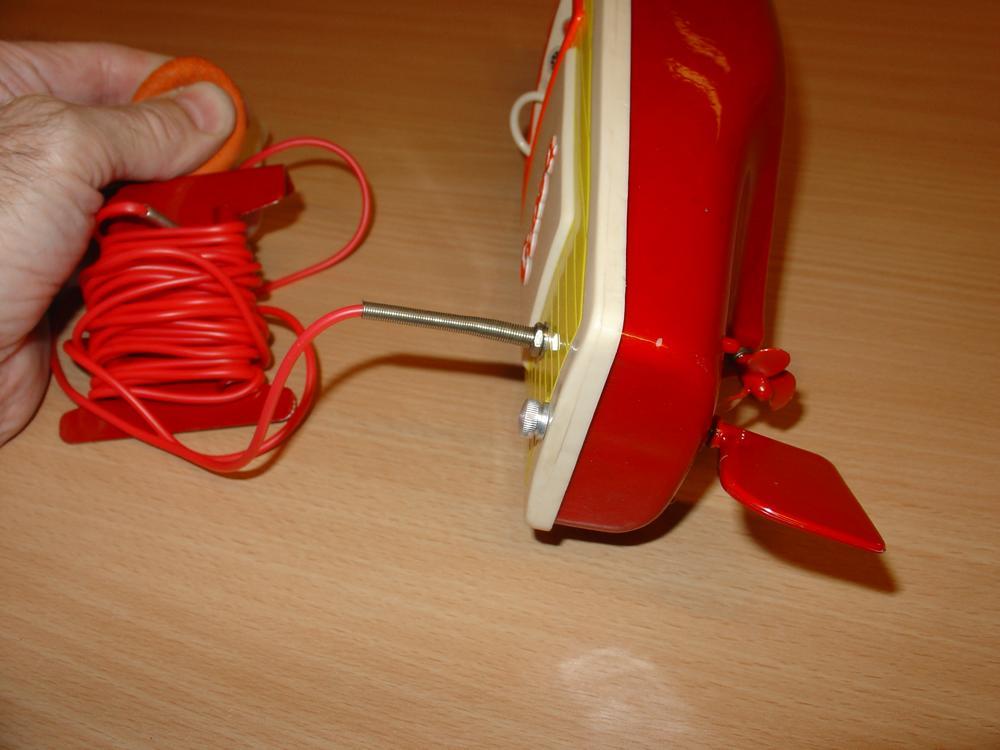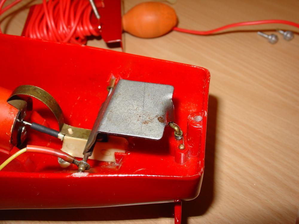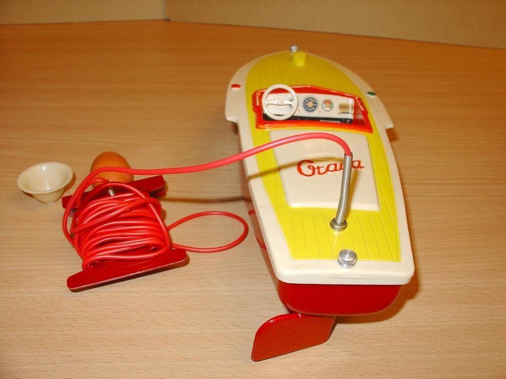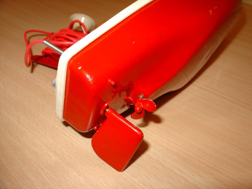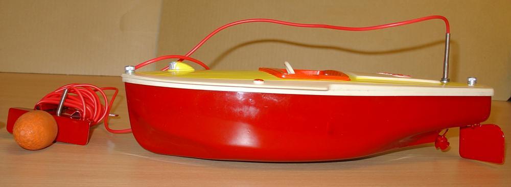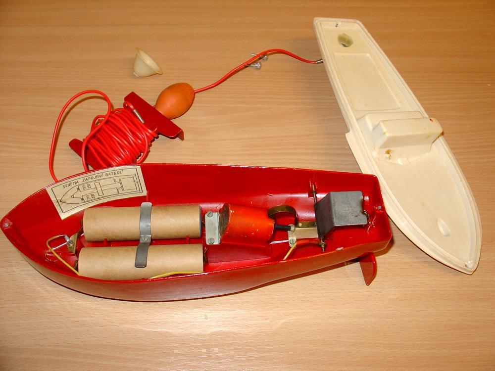Toto technicky velmi jednoduché řešení s bužírkou o délce cca 4 m umožňovalo v té době velmi komfortní ovládání loďky při vodních radovánkách. Nepotřebovalo zdroje energie a nehrozilo zničení případným potopením loďky. V uvedeném stavu chybí pouze čelní sklo a gumový balónek do ruky již nese značné známky opotřebení v místech, kde se dotýkaly prsty obsluhy. Z toho důvodu byl odmontován opěrný kalíšek, proti kterému se balónek palcem stlačoval, aby se mohlo stlačování balónku provádět po celém jeho objemu (jinak se deformovala jen část, která vystupovala ven z kalíšku, a tím je značně opotřebená - zvětralá).