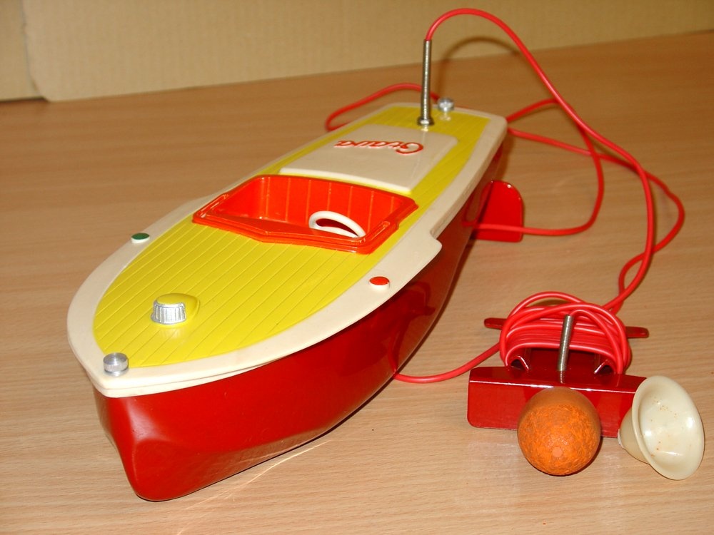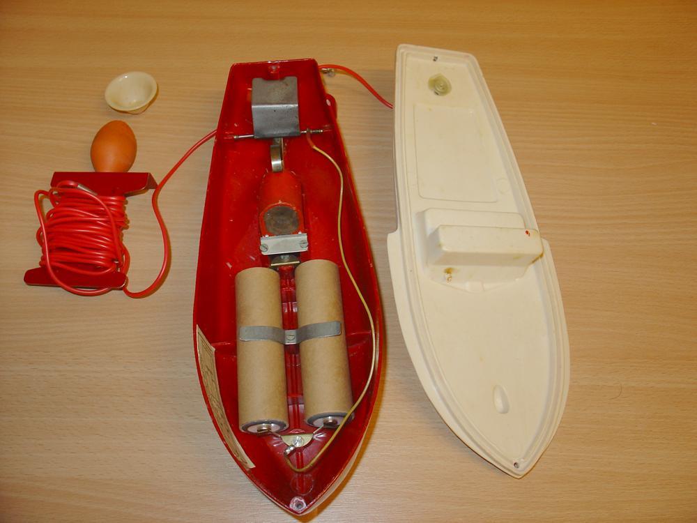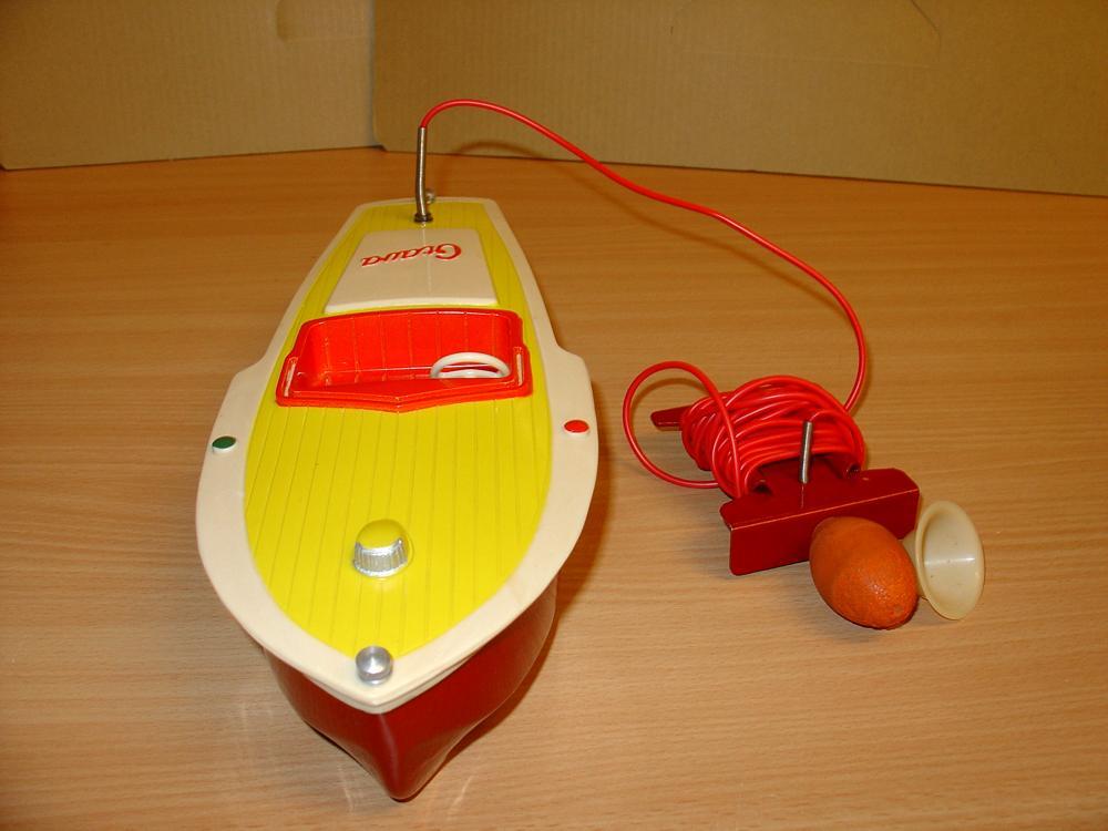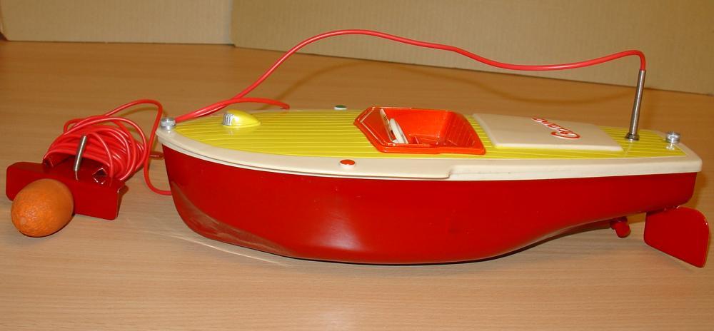 Zajímavý člun na dálkové ovládání pomocí pneumatického propojení tenkou bužírkou z PVC mezi ovládacím gumovým balónkem (podobným jako u rozprašovače) a balónkem, který tlačil na kyvnou vačku nad kormidelní páčkou. Zároveň pohyb vačky spínal chod motorku, takže motorek byl vypnutý pouze v momentě, kdy kormidlo bylo vykloněno do pravého úhlu (tudíž by pouze brzdilo). V ostatních polohách byl motorek v chodu, a tak bylo možno řídit směr plavby. Z uvedených důvodů člun může plout pouze vpřed. Člun je funkční, jelikož se podařilo nahradit malý balónek v trupu lodi, který snad ve všech známých případech byl natolik zpuchřelý, že po něm zbyla nedefinovatelná lepivá hromádka.