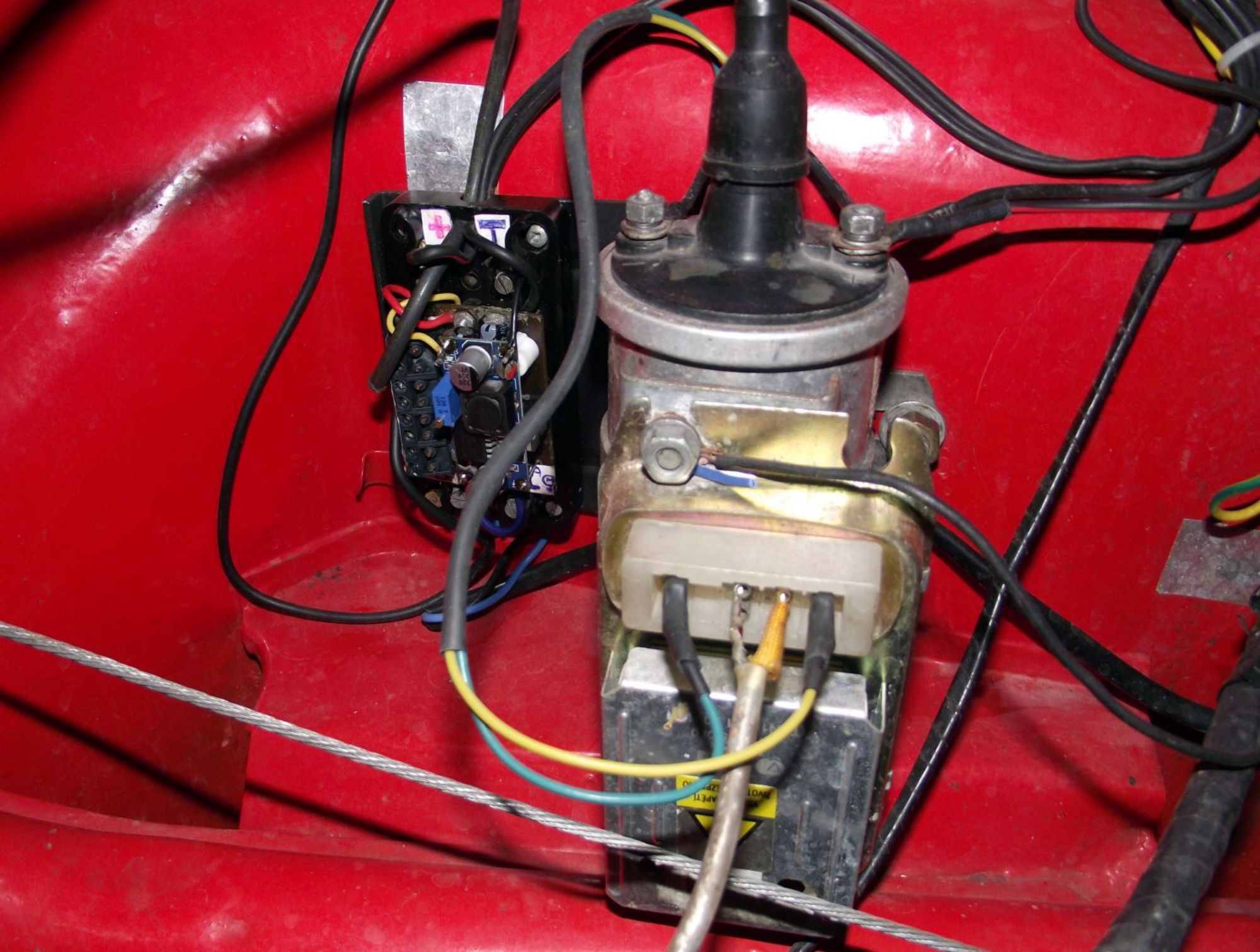 Pozor na rozdíl v délce těla uchycení rozdělovače v bloku – je o 2–3 mm kratší. Vyřešil jsem to ofrézováním dosedací plochy (obr. 11). Alternativou je výroba delší spojky/palce. Bez úpravy by palec nedostatečně zapadl do ozubeného kola na vačkovém hřídeli. Při výměně rozdělovače je nutné vyměnit i zapalovací cívku – důvod je zřejmý. Tranzistorovou jednotku jsem umístil na cívku (obr. 12); kdo nechce, skryje ji v motorovém prostoru. Komponenty jsou stále levně k dostání.