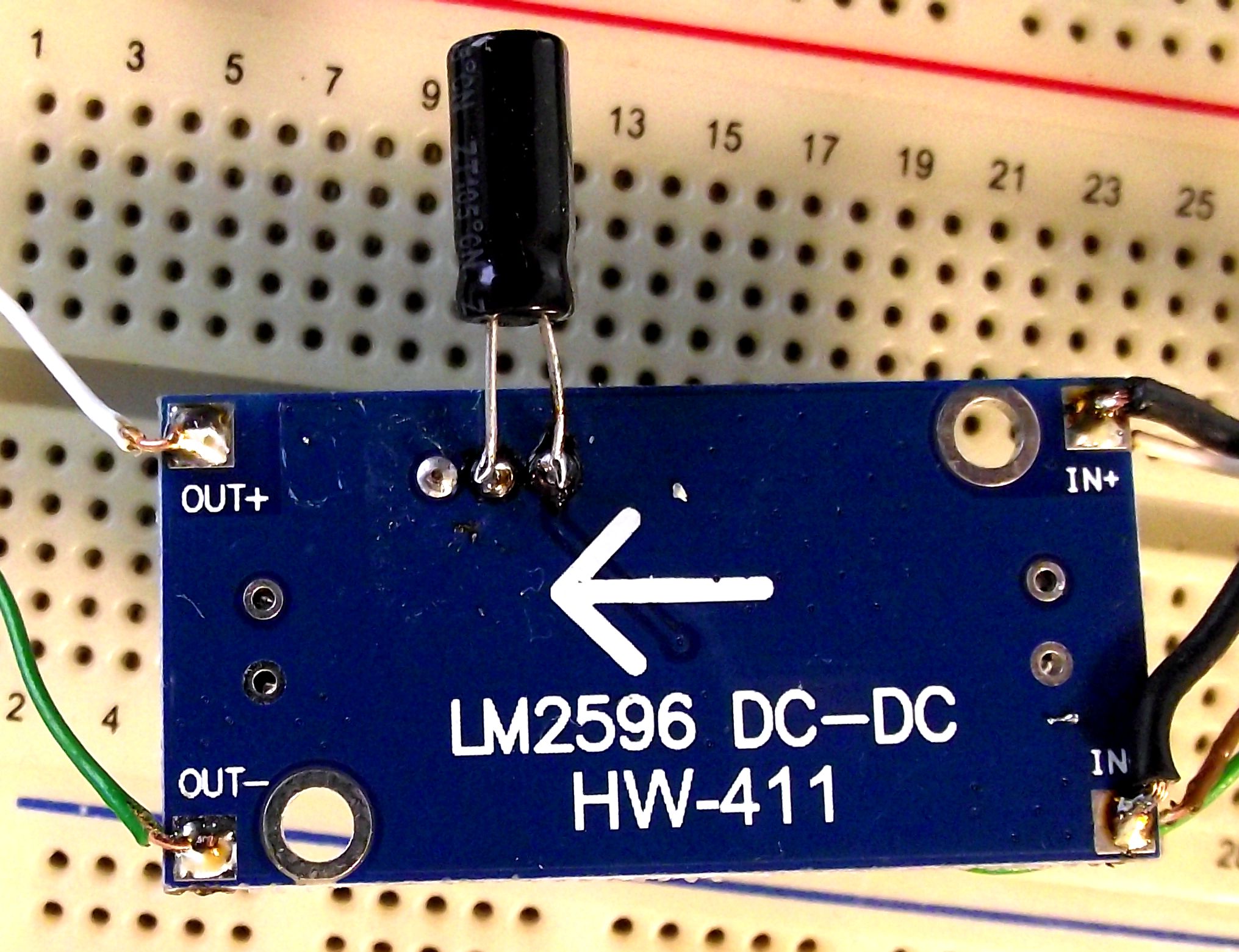 Při přehrabování šuplíků jsem objevil zapadlého Číňana (DC/DC měnič LM2596). Koukal jsem na něj, on na mě mrkal. Došlo mi to: co takhle připojit kondenzátor na regulační potenciometr – co to udělá?