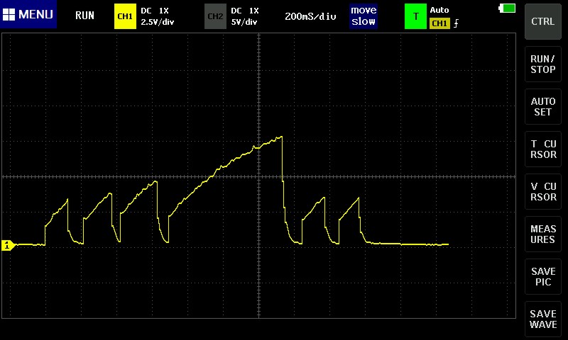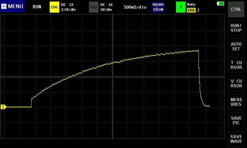 Při napájení měniče cca U = 14 V a nastaveném výstupu U = 12 V dává náběhový kondenzátor Cn o kapacitě 100 µF náběhový čas přibližně 1 s. 1000 µF = 10 s. Změna vstupního napětí modulu nemění dobu náběhu Soft-startu. Také výstupní zátěž modulu nemění dobu náběhu Soft-startu. Zvyšováním výstupního napětí (U výst.) se úměrně zvyšuje doba náběhu Soft-startu. Charakteristika náběhu Soft-startu není lineární, ale logaritmická – viz obr. 3, snímek obrazovky osciloskopu. Náběh Soft-startu nezačíná od nuly, ale od minimálního možného výstupního napětí modulu (1,23 V).