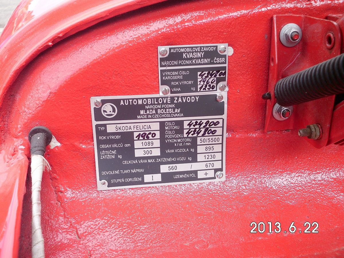 Pokračování — Vážený pane Vaněčku, děkuji i za šíření pozitivní energie. Snažím se o to také — chceme přece žít, ne přežívat a nadávat! Bližší údaje o mém voze: Škoda Felicia typ 949/9, vyrobena 22. 5. 1961. Karoserie č. 10153, motor č. 519929, váha 420 kg, výrobní série č. 10. Předmět historické hodnoty. ? Fotografie zde je ještě před dokončením do současného stavu — třeba bez prahové lišty od vás.