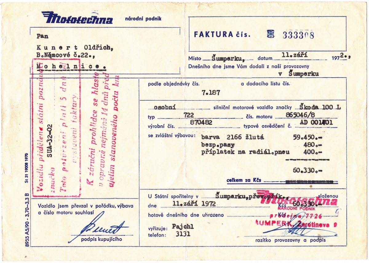 Petr Bezstarosti, Nová Paka — Škoda 110L. Děkuji vám za zaslané věci a doufám, že opět na své faktuře budu mít sluníčko :-) V příloze zasílám příběh mého veterána. Děkujeme vám, my oba. YouTube kanál.