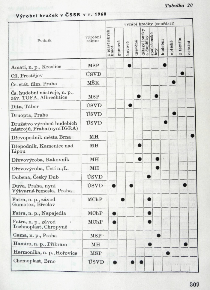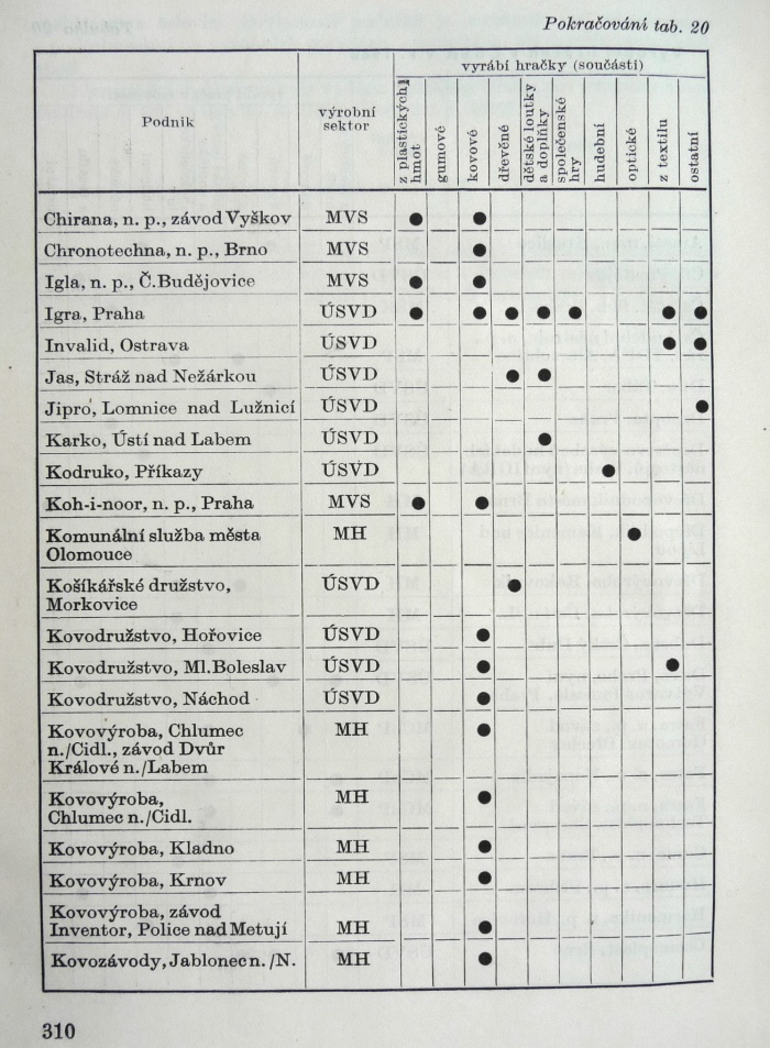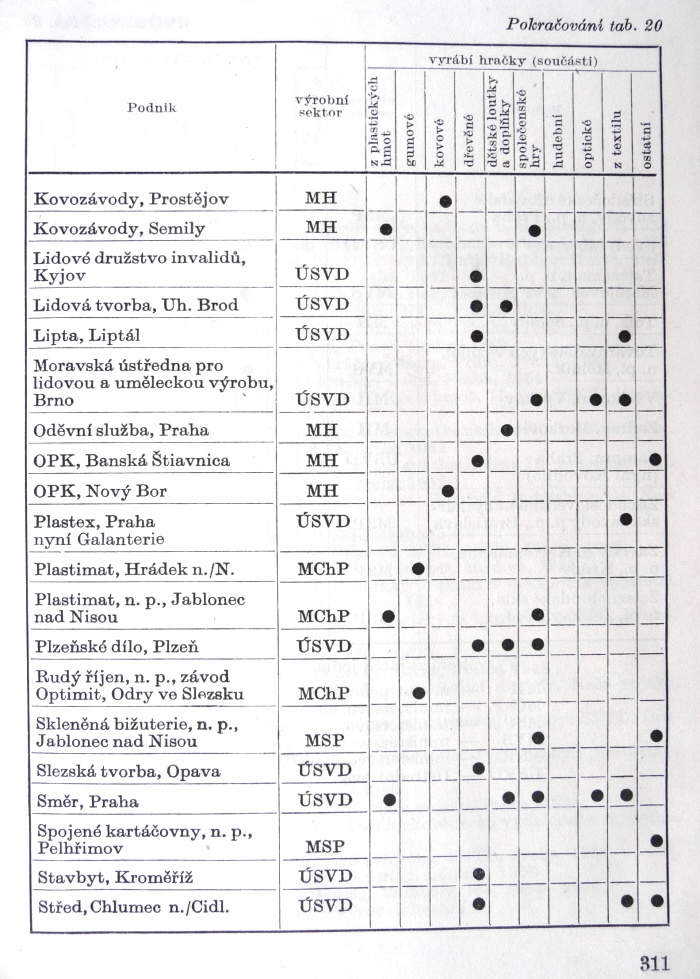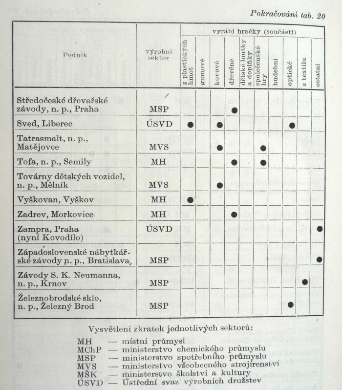 Neustálé přejmenovávání a rozčleňování podniků, které nám historicky trochu komplikuje přehled, zřejmě mělo navodit dojem, že národní hospodářství je dobře řízeno. Přitom docházelo k tomu, že v rámci rozvoje polytechnické výchovy k výrobě hraček přispívali i výrobci, kteří neměli v tomto druhu výroby ani zkušenosti ani know-how. Nicméně faktem zůstává, že díky tomu byla nabídka hraček domácí produkce v té době docela pestrá.