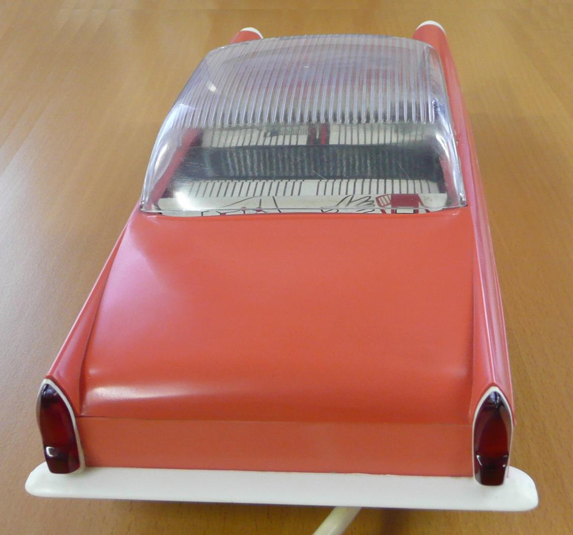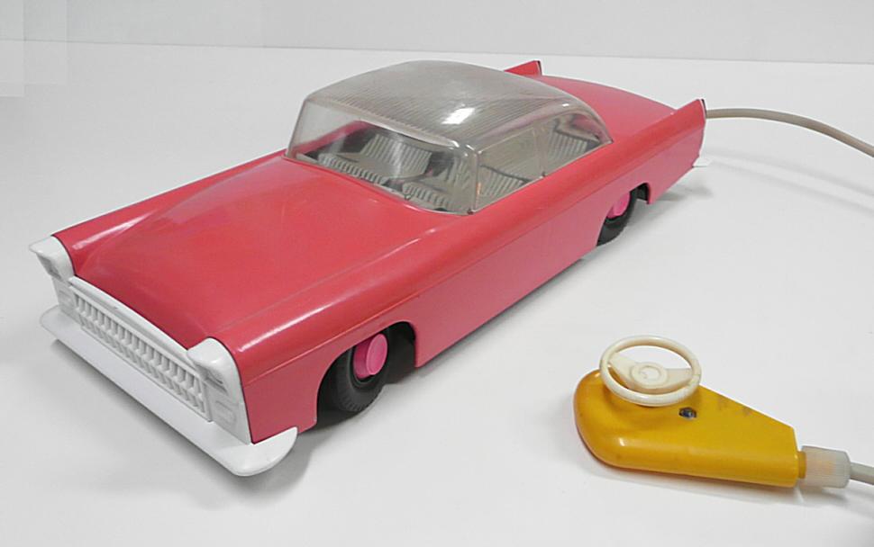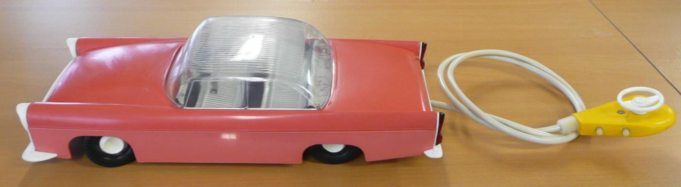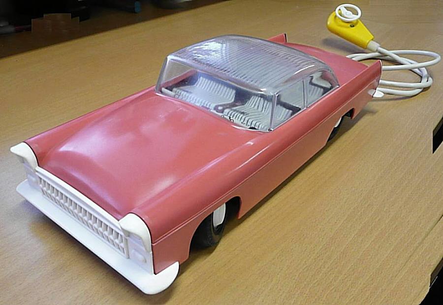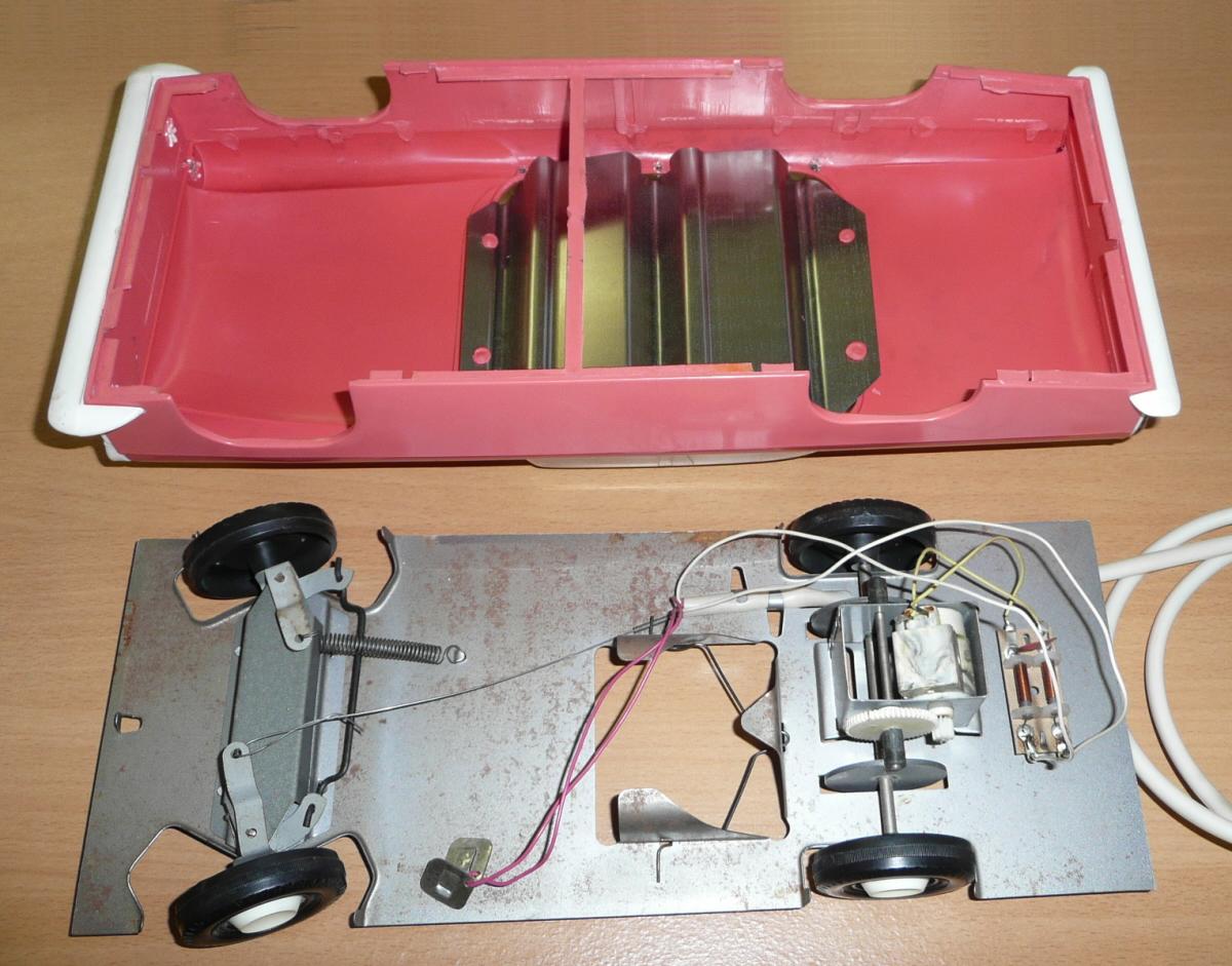 Na bowden. Shodnou ovládací rukojeť jsem nalezl před mnoha lety (více než 20) a použil ji k autobusu Škoda RTO, který měl tehdy ne příliš šikovný ovladač (poškozený) s pouhou páčkou na řízení (viz sekce autobus RTO, 1. verze bez volantu). Za pozornost stojí použitý třecí převod na hřídelku kol. Nečistoty mu zřejmě tolik nevadí jako ozubenému soukolí a navíc může sloužit jako spojka a chránit tak motorek a baterie před přetěžováním (třeba když auto narazí na překážku a motor zůstane pod napětím = zkrat přes kotvu). Vyzkoušíme. Překvapivě jednoduché a spolehlivé i po letech je rozebrání vozu - stačí jen rukou odtlačit karoserii od plechového podvozku... Za identifikaci názvu i výrobce děkujeme Astrid B. z Německa.