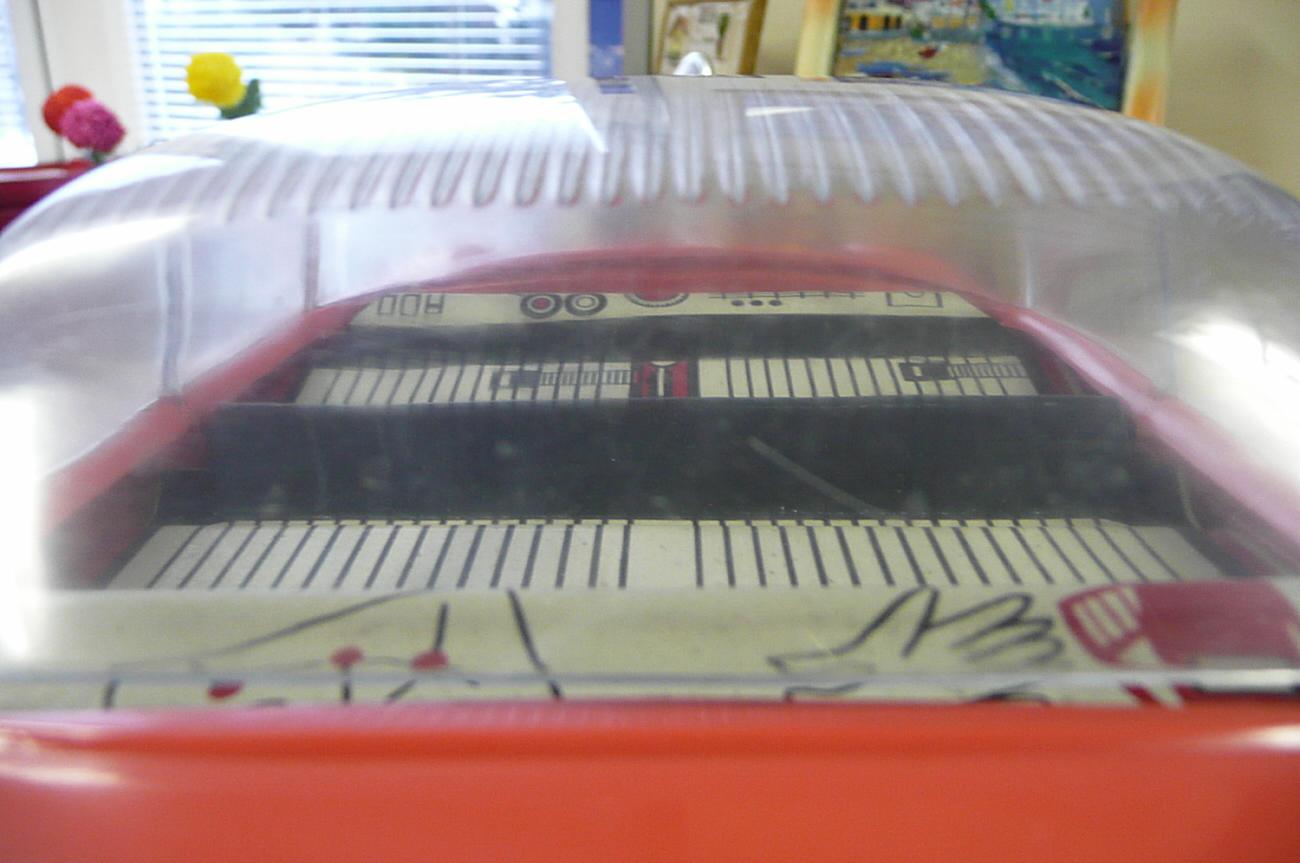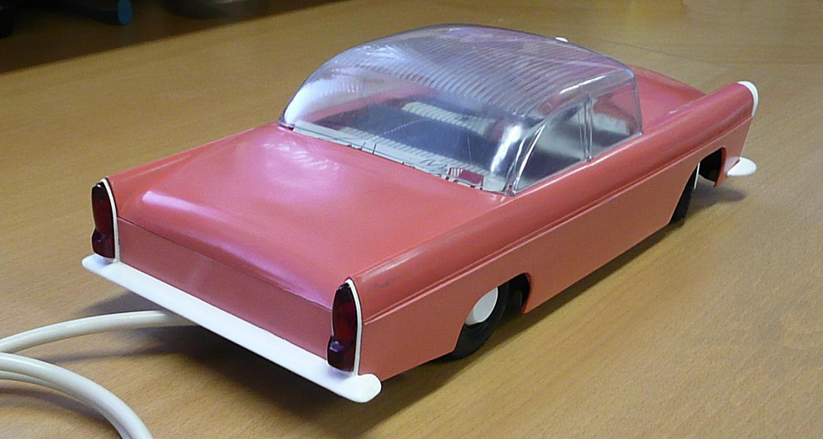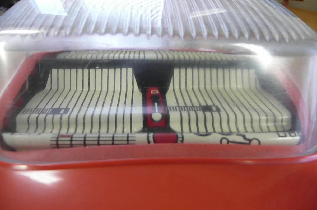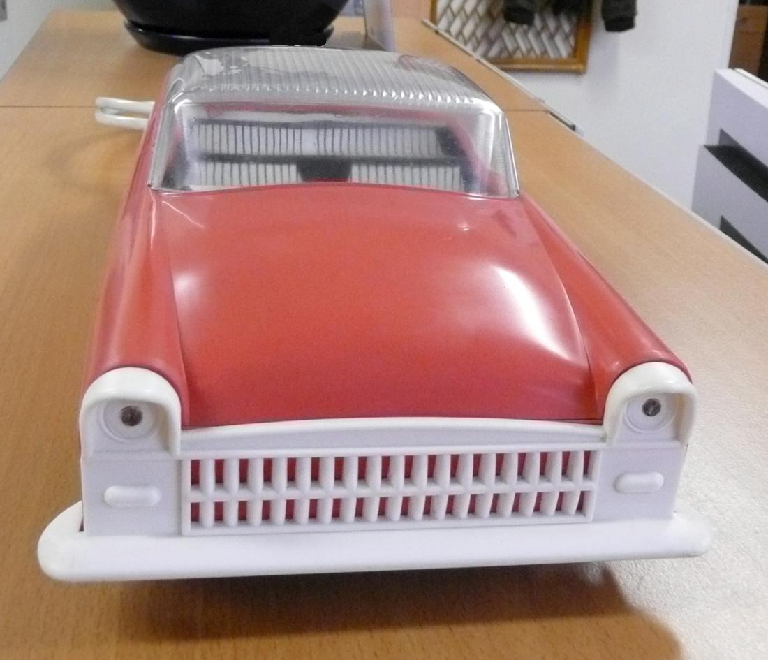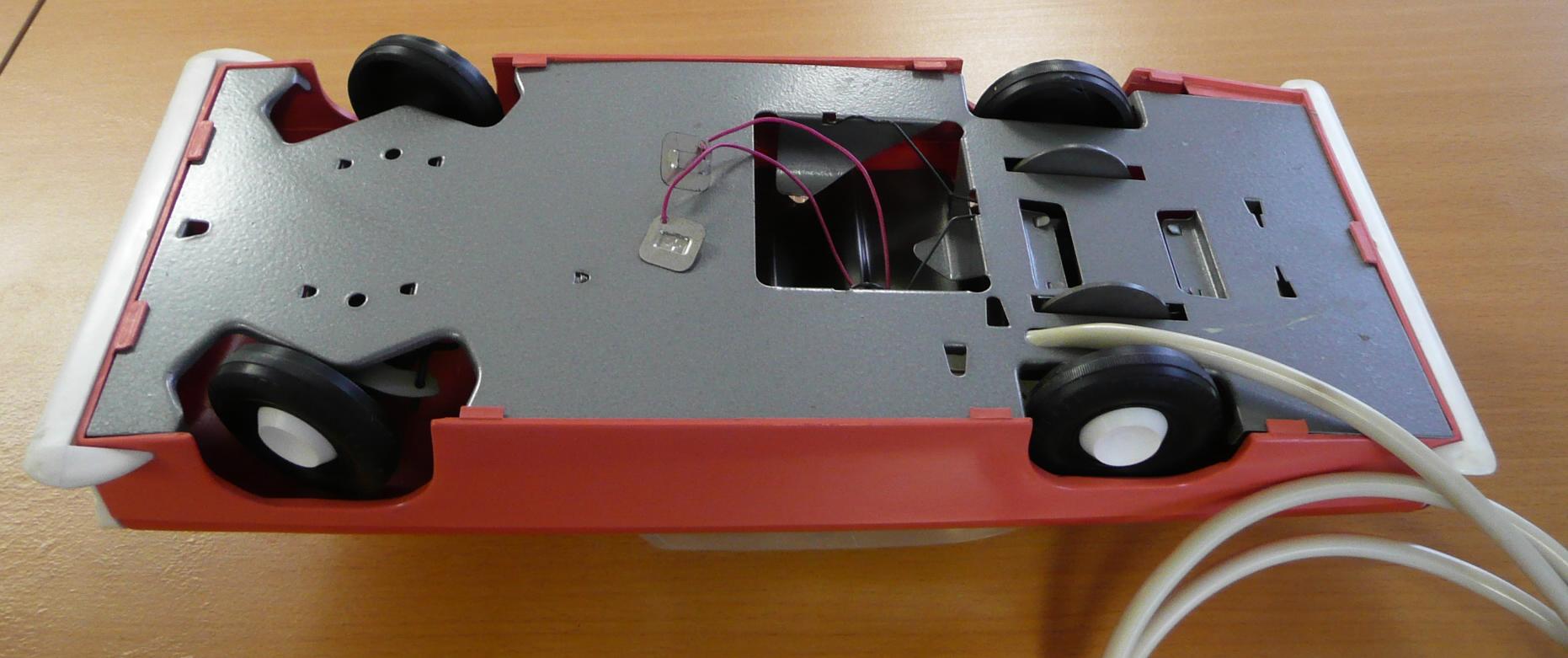 Na bowden. Shodnou ovládací rukojeť jsem nalezl před mnoha lety (více než 20) a použil ji k autobusu Škoda RTO, který měl tehdy ne příliš šikovný ovladač (poškozený) s pouhou páčkou na řízení (viz sekce autobus RTO, 1. verze bez volantu). Za pozornost stojí použitý třecí převod na hřídelku kol. Nečistoty mu zřejmě tolik nevadí jako ozubenému soukolí a navíc může sloužit jako spojka a chránit tak motorek a baterie před přetěžováním (třeba když auto narazí na překážku a motor zůstane pod napětím = zkrat přes kotvu). Vyzkoušíme. Překvapivě jednoduché a spolehlivé i po letech je rozebrání vozu - stačí jen rukou odtlačit karoserii od plechového podvozku... Za identifikaci názvu i výrobce děkujeme Astrid B. z Německa.