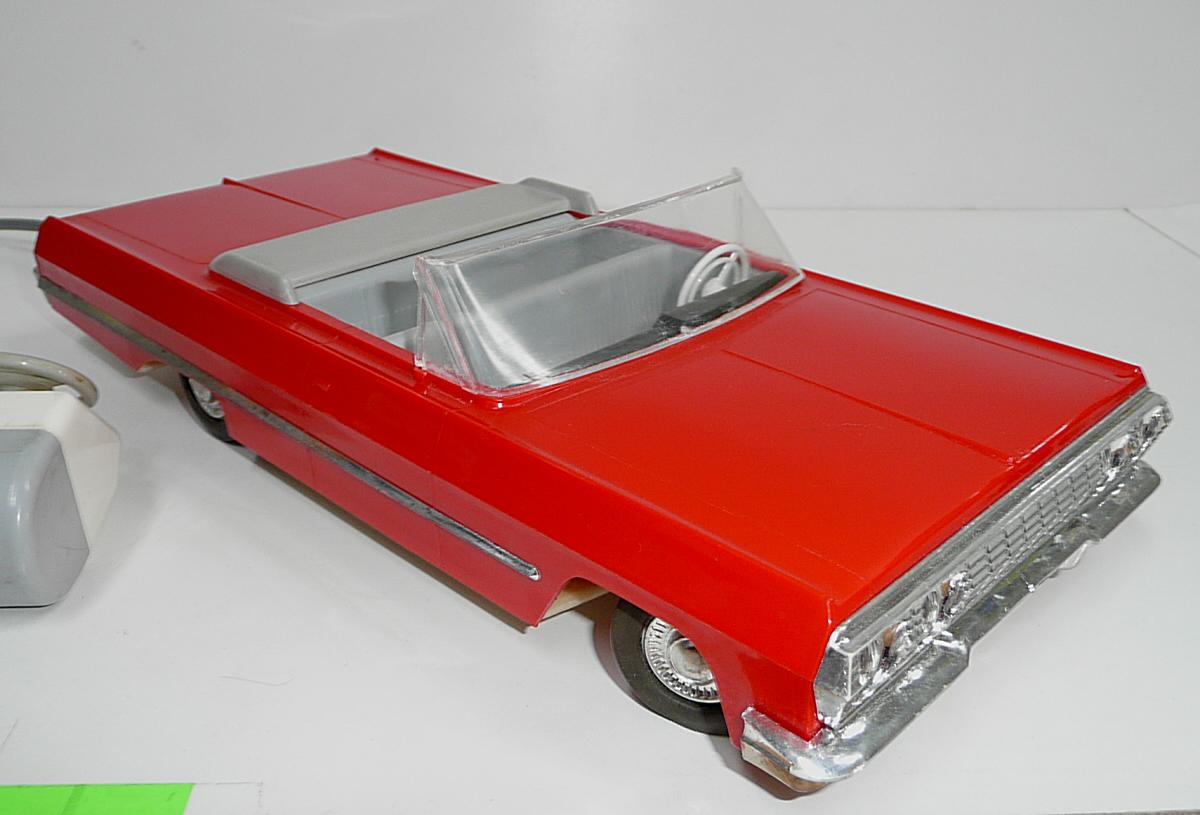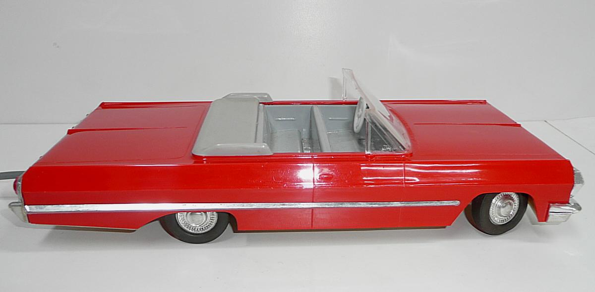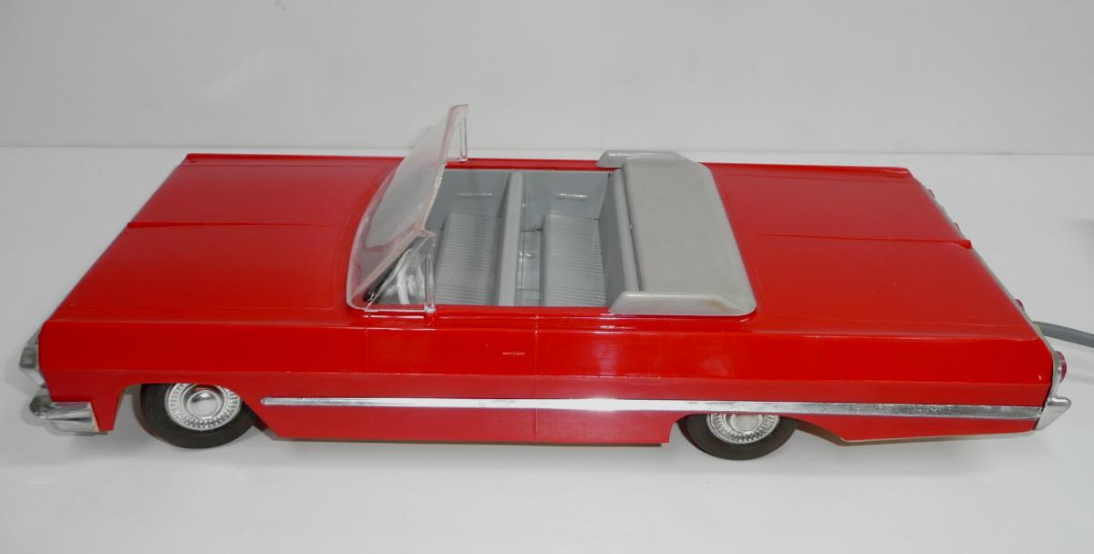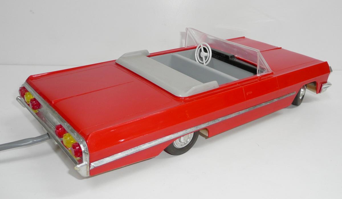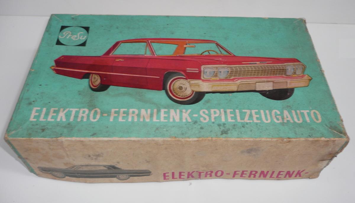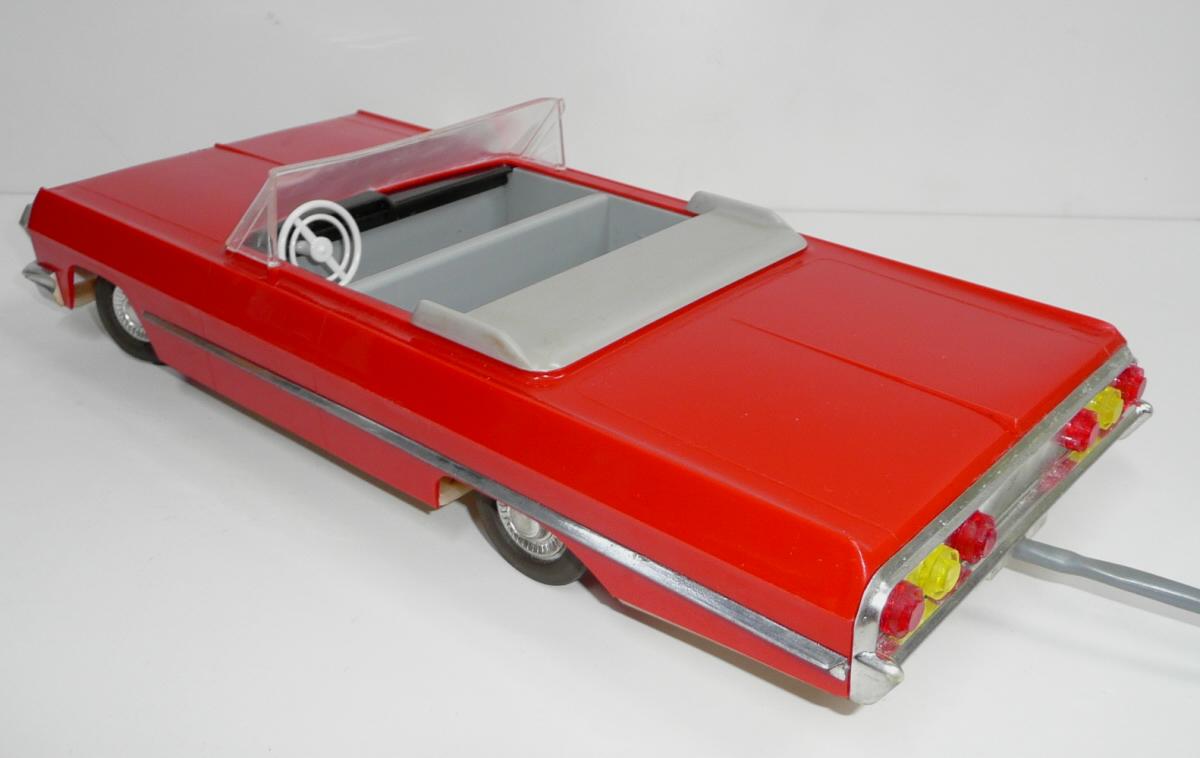 Jede vpřed, vzad. svítí světlomety. Perfektní řízení, přesné a lehounké. Důvodem velmi komfortního řízení je silnější struna v bowdenu a absence protipružiny (ta umožňuje používat struny o menším průměru, které jen táhnou, zpětný pohyb pak zajistí pružina). Nevýhodou řešení s protipružinou je, že se při řízení neustále přetahujeme s pružinou, takže jedním směrem je pohyb volantu snazší. Řešení s tuhou strunou bez pružiny umožňuje citlivější a přirozenější řízení, ovšem za cenu tužšího bowdenu, který není radno příliš ohýbat při vkládání do krabice. Další pozoruhodnou vlastností je výkyvná pohonná jednotka, což umožňuje plavnou jízdu i po nerovnostech, i když je poháněno jen jedno kolo. Hračka je kompletní a funkční. Krabice je asi společná pro sedan i kabriolet, zachovala se na ní i napsaná původní cena 90,- (snad v Kčs). Velice líbivý model známého velkého amerického vozu Chevrolet Impala z roku 1958, tentokrát ve verzi kabriolet. Tato hračka oproti dalším propracovaným typům téhož výrobce nemá SPZ. Asi by ji skutečný vůz v tehdejším NDR ani nedostal.
