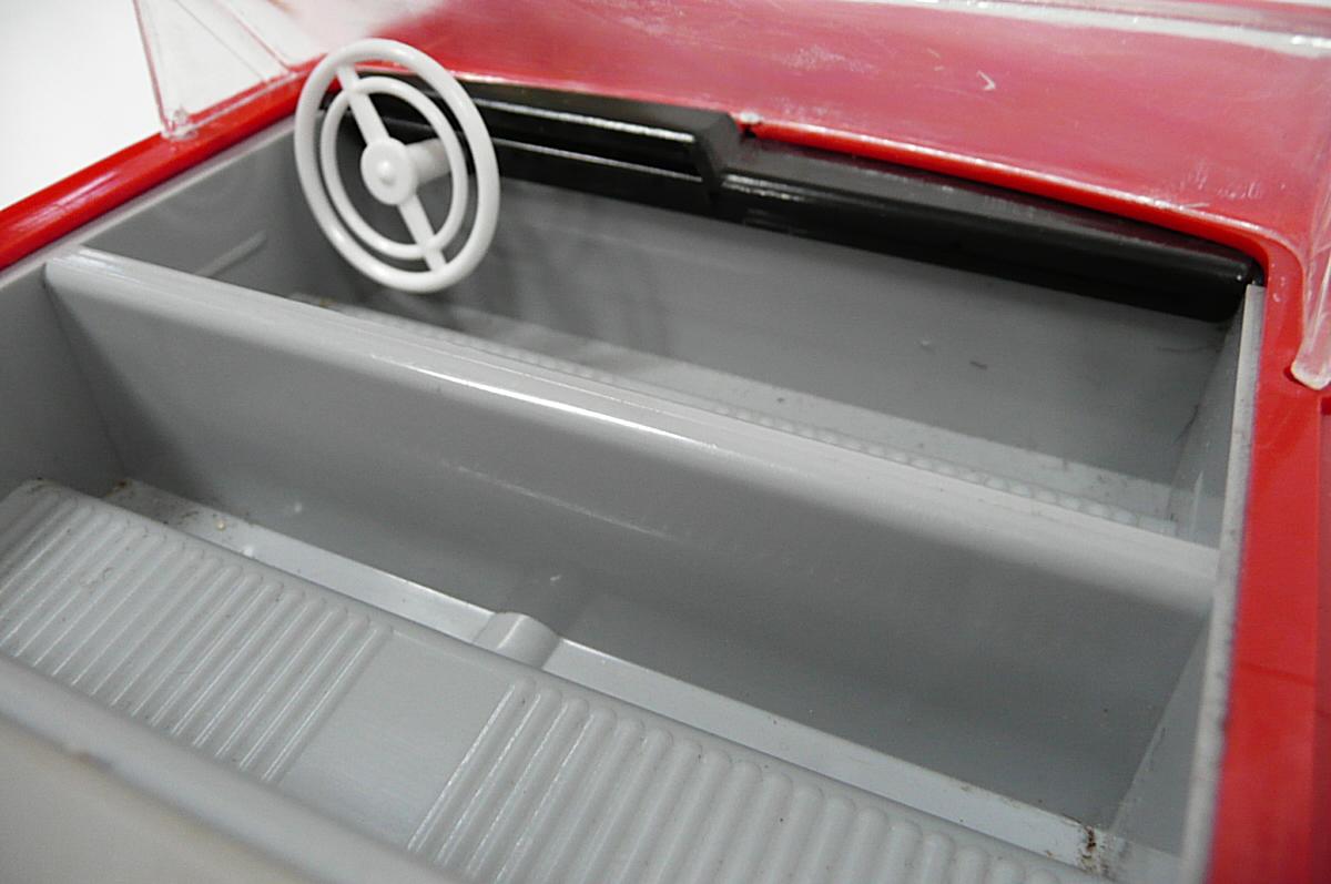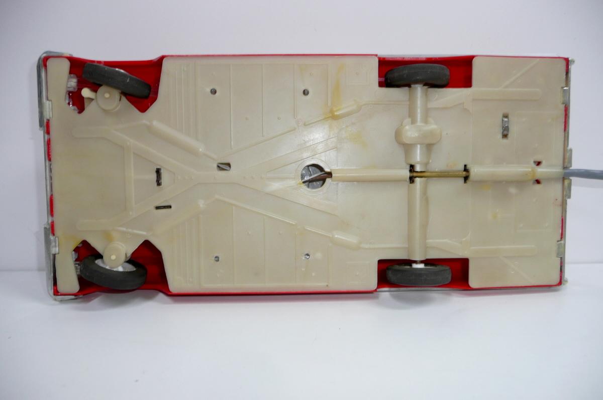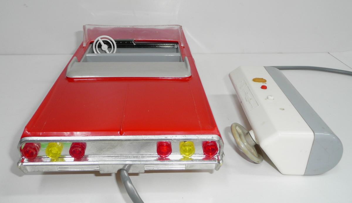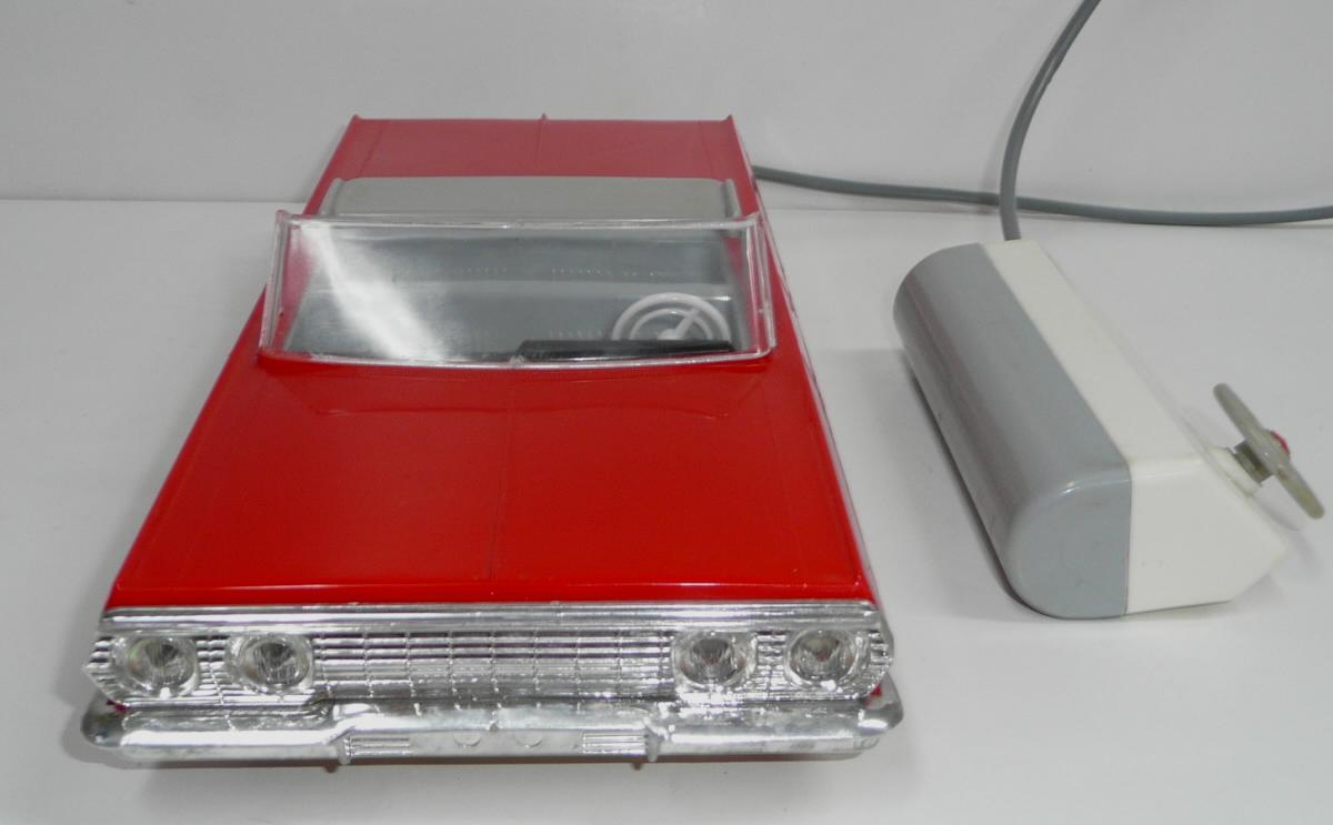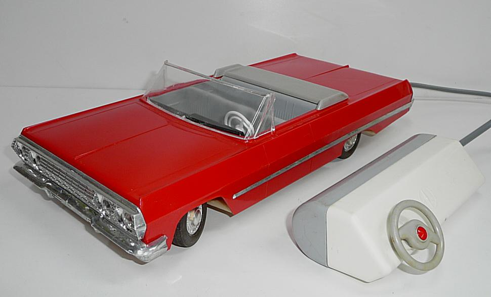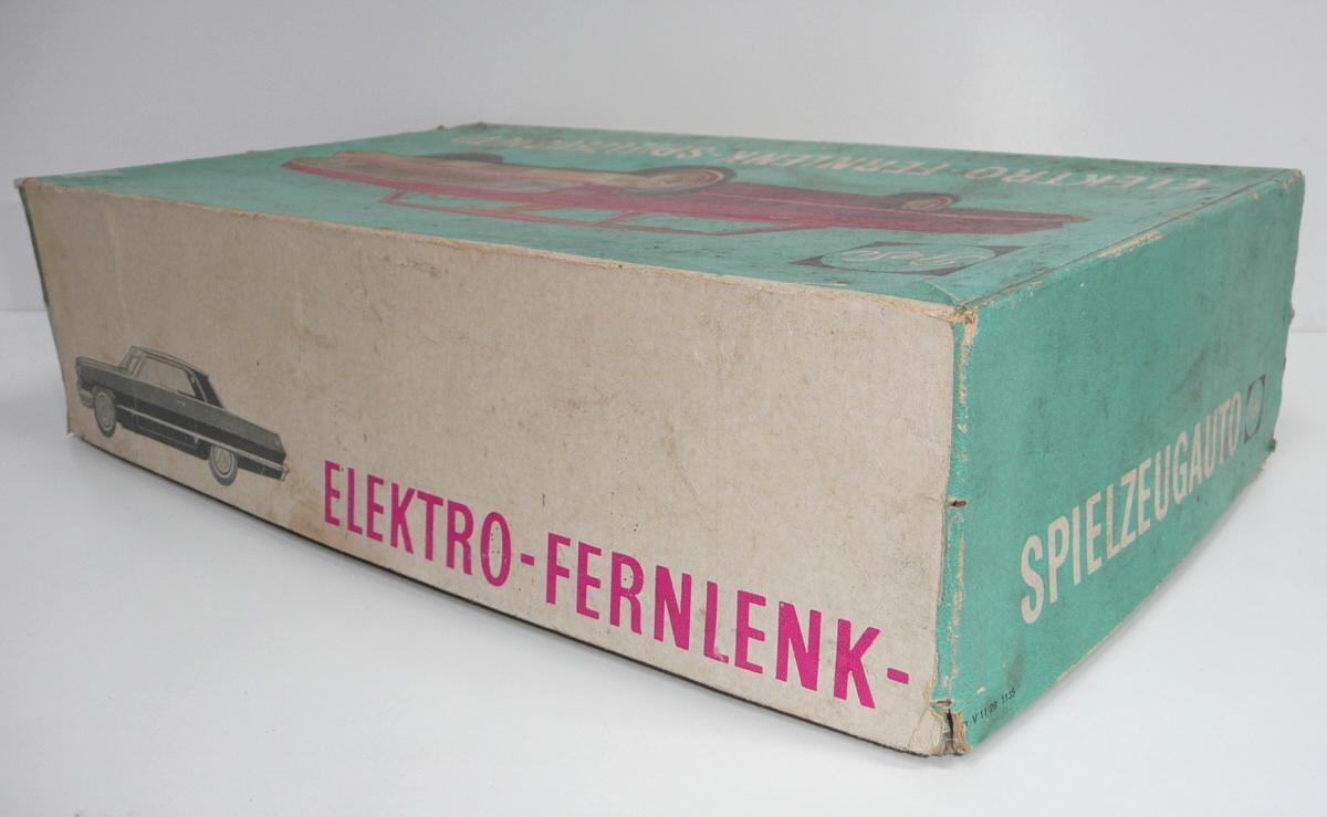 Jede vpřed, vzad. svítí světlomety. Perfektní řízení, přesné a lehounké. Důvodem velmi komfortního řízení je silnější struna v bowdenu a absence protipružiny (ta umožňuje používat struny o menším průměru, které jen táhnou, zpětný pohyb pak zajistí pružina). Nevýhodou řešení s protipružinou je, že se při řízení neustále přetahujeme s pružinou, takže jedním směrem je pohyb volantu snazší. Řešení s tuhou strunou bez pružiny umožňuje citlivější a přirozenější řízení, ovšem za cenu tužšího bowdenu, který není radno příliš ohýbat při vkládání do krabice. Další pozoruhodnou vlastností je výkyvná pohonná jednotka, což umožňuje plavnou jízdu i po nerovnostech, i když je poháněno jen jedno kolo. Hračka je kompletní a funkční. Krabice je asi společná pro sedan i kabriolet, zachovala se na ní i napsaná původní cena 90,- (snad v Kčs). Velice líbivý model známého velkého amerického vozu Chevrolet Impala z roku 1958, tentokrát ve verzi kabriolet. Tato hračka oproti dalším propracovaným typům téhož výrobce nemá SPZ. Asi by ji skutečný vůz v tehdejším NDR ani nedostal.