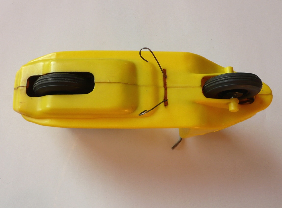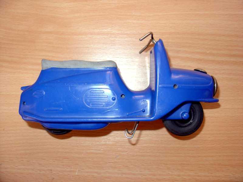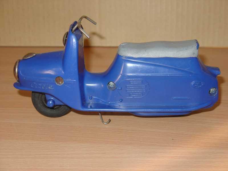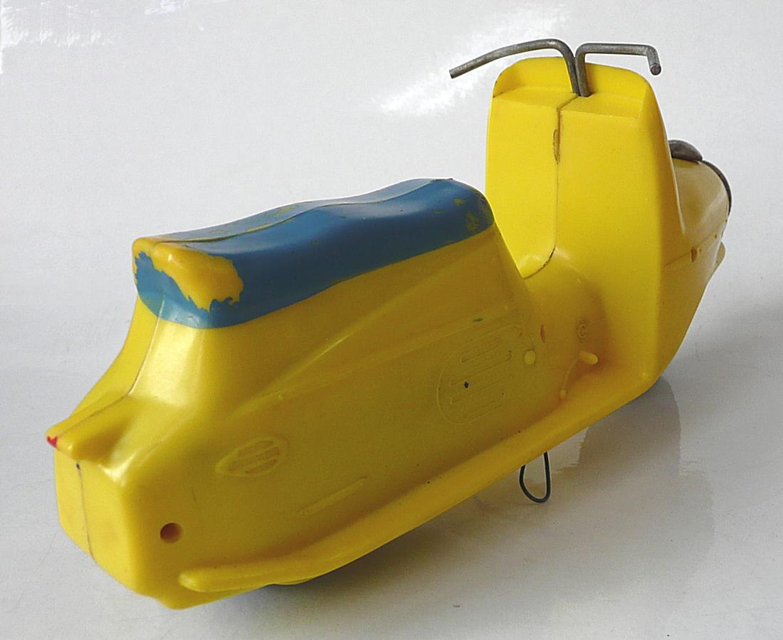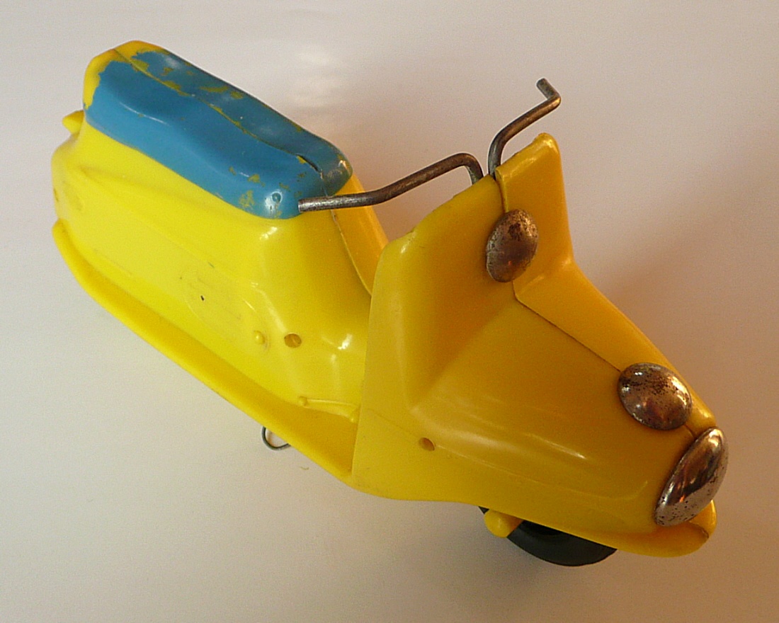 Známá hračka. Jako kluk jsem tuto hračku dostal od rodičů k nějakému výročí. Tento můj žlutý exemplář se však již nedochoval (přidáváme foto ale žlutého nově zakoupeného mého švagra V. Vaněčka). Už tehdy mne překvapoval dlouhým dojezdem setrvačníkového pohonu. Při rozebrání vypadal setrvačník celkem normálně, ale byl dost hmotný, i když nebyl udělán vzorně podle fyzikálních zákonů, aby akumuloval co nejvíce kinetické energie (co nejvíce hmoty co nejdále od osy otáčení), tak hodinářská tradice výrobce se nezapřela (to vím však až dnes). Oběma exemplářům chybí obtisk poznávací značky pod koncovým světlem a bužírky jako rukojeti na řídítkách.