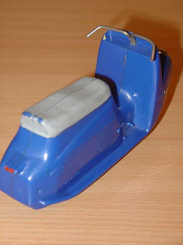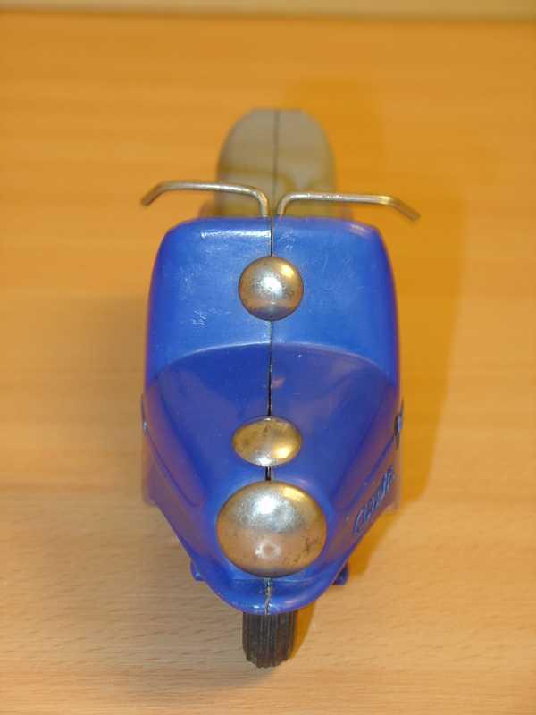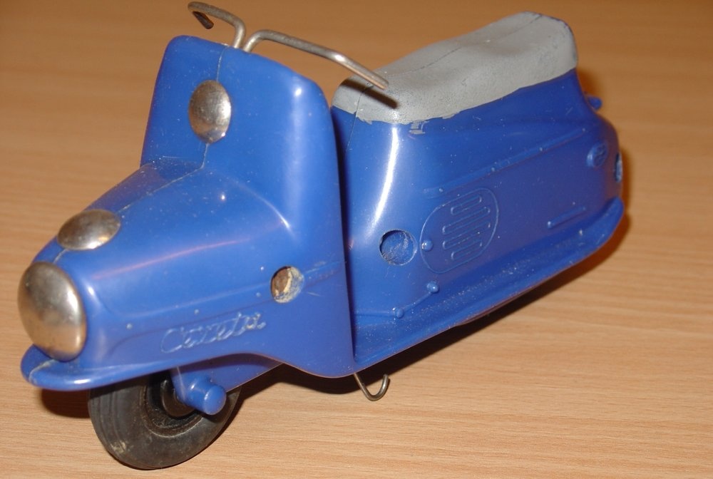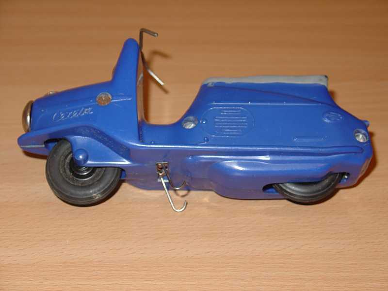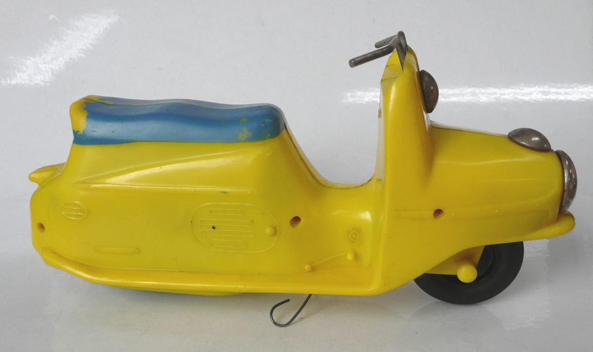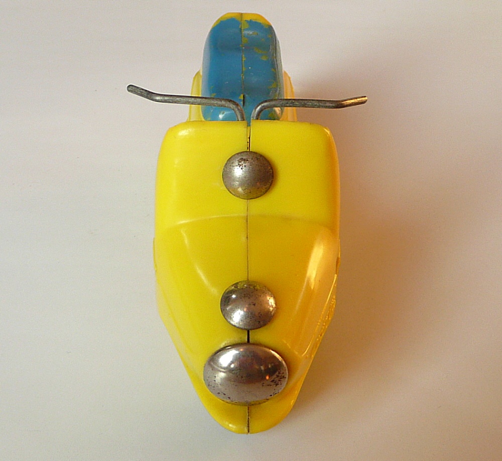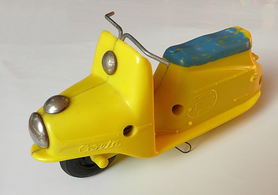 Známá hračka. Jako kluk jsem tuto hračku dostal od rodičů k nějakému výročí. Tento můj žlutý exemplář se však již nedochoval (přidáváme foto ale žlutého nově zakoupeného mého švagra V. Vaněčka). Už tehdy mne překvapoval dlouhým dojezdem setrvačníkového pohonu. Při rozebrání vypadal setrvačník celkem normálně, ale byl dost hmotný, i když nebyl udělán vzorně podle fyzikálních zákonů, aby akumuloval co nejvíce kinetické energie (co nejvíce hmoty co nejdále od osy otáčení), tak hodinářská tradice výrobce se nezapřela (to vím však až dnes). Oběma exemplářům chybí obtisk poznávací značky pod koncovým světlem a bužírky jako rukojeti na řídítkách.