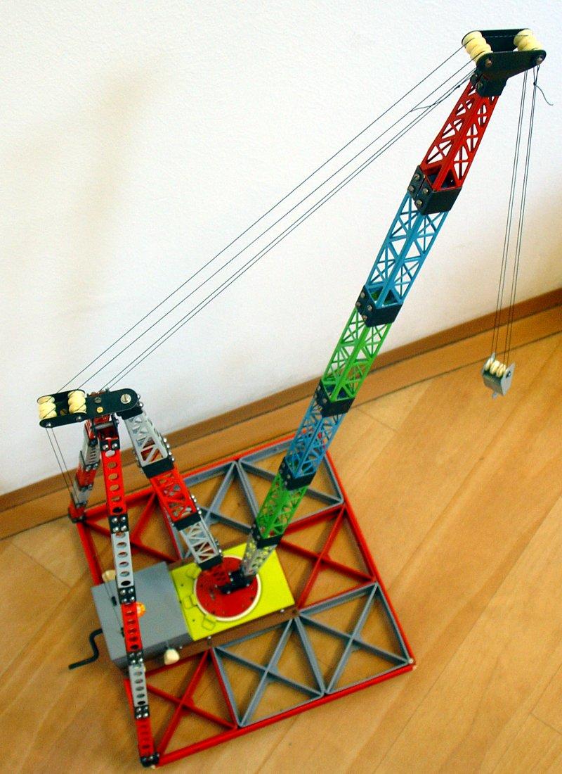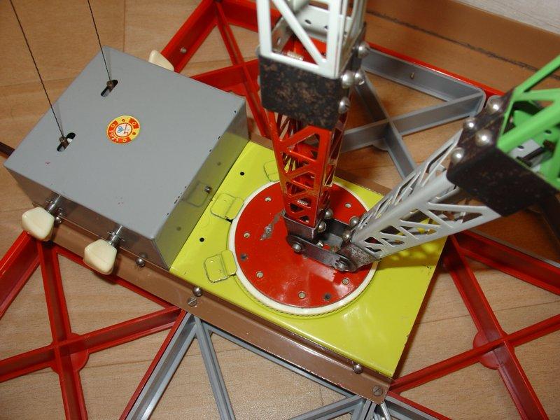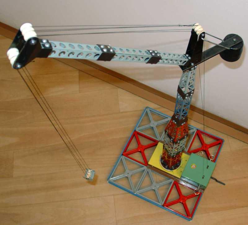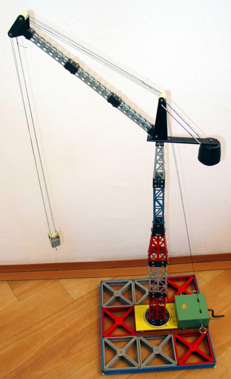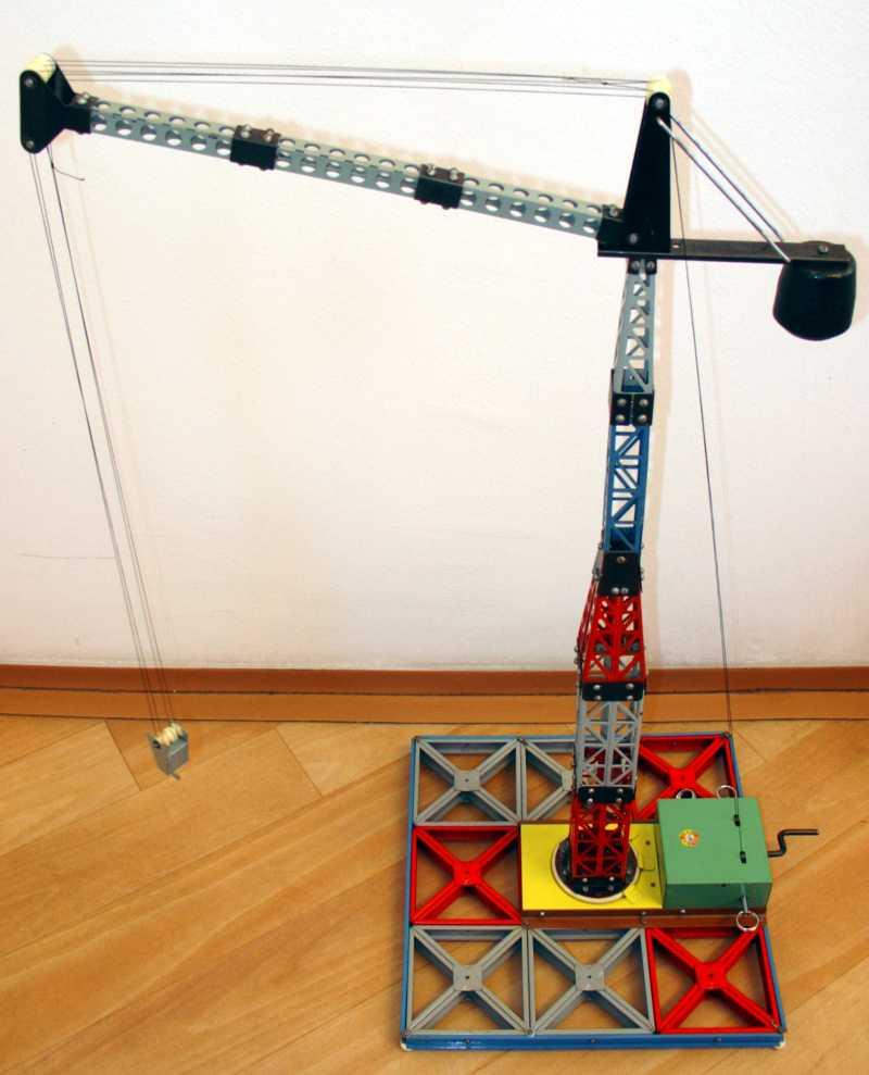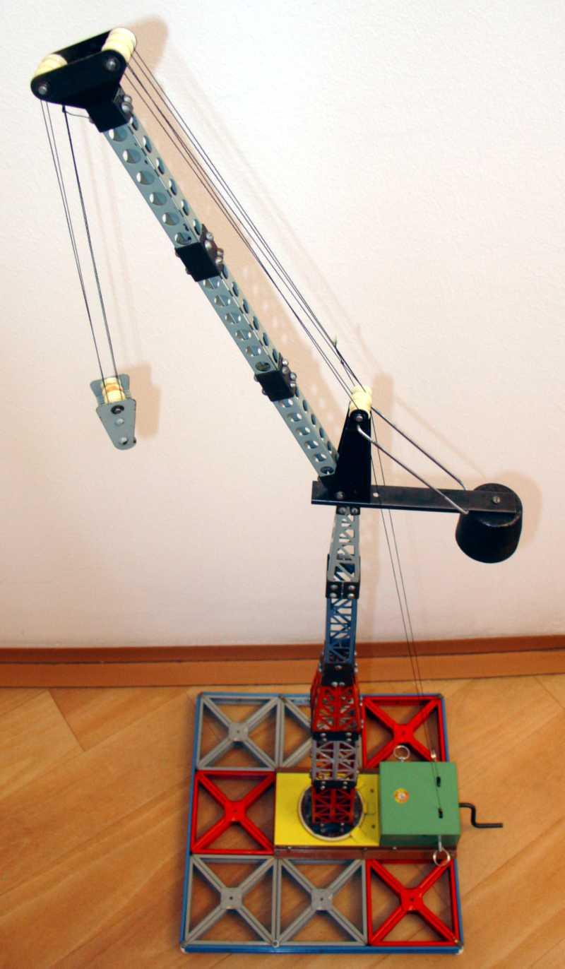 Hračka byla na ruční pohon kličkou a oproti jiným podobným, které měly pro každý pohyb zvláštní kličku, tato byla vybavena poměrně komplikovanou převodovou skříní, v níž bylo možno zařadit požadovaný pohyb na jedinou pohonnou hřídelku s kličkou. Pohyby byly tři: zvedání břemene, sklon ramene a otáčení jeřábu kolem svislé osy. Proto jsou v převodové skříni dvě hřídelky s navíjecími bubny na provázky a jedna k zařazení volného kuželového kola s pastorkem pro otáčení plotny, na níž se stavěly jednotlivé druhy jeřábů. Stavebnice obsahuje opravdu úctyhodné množství součástek. Několik jich však chybí: dvě hřídelky pro pohony (jsou již doplněny z jiné stavebnice), zarážka pro fixaci vzájemné polohy ramen, spojnice. Asi padesát samořezných šroubků s půlkulovou hlavou velikosti 2,6 x 6 mm jsem již také doplnil z jiné stavebnice.