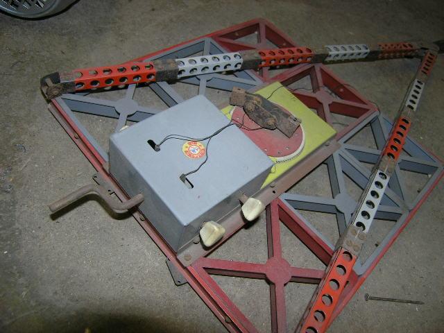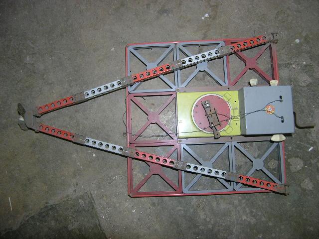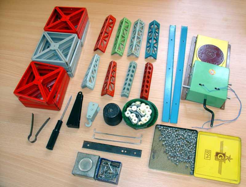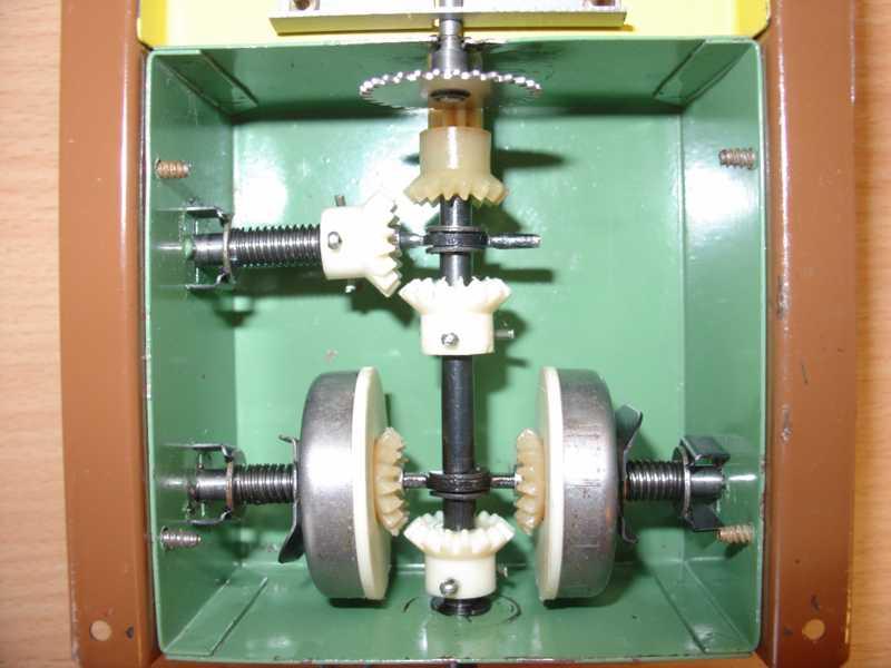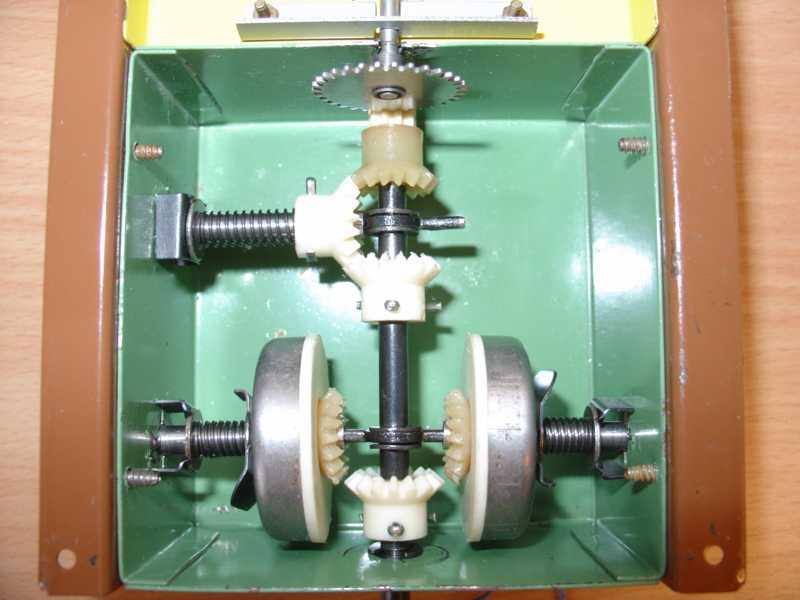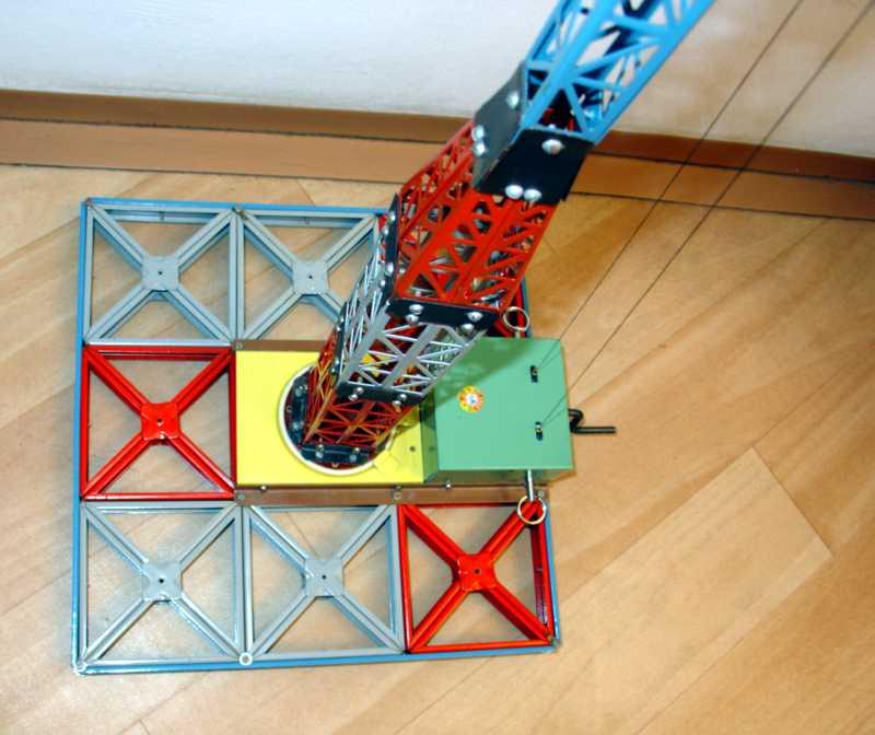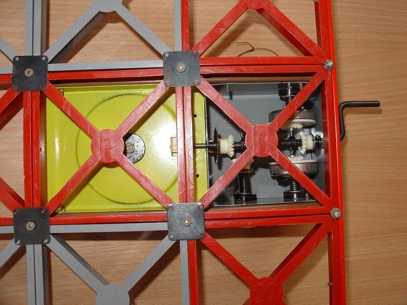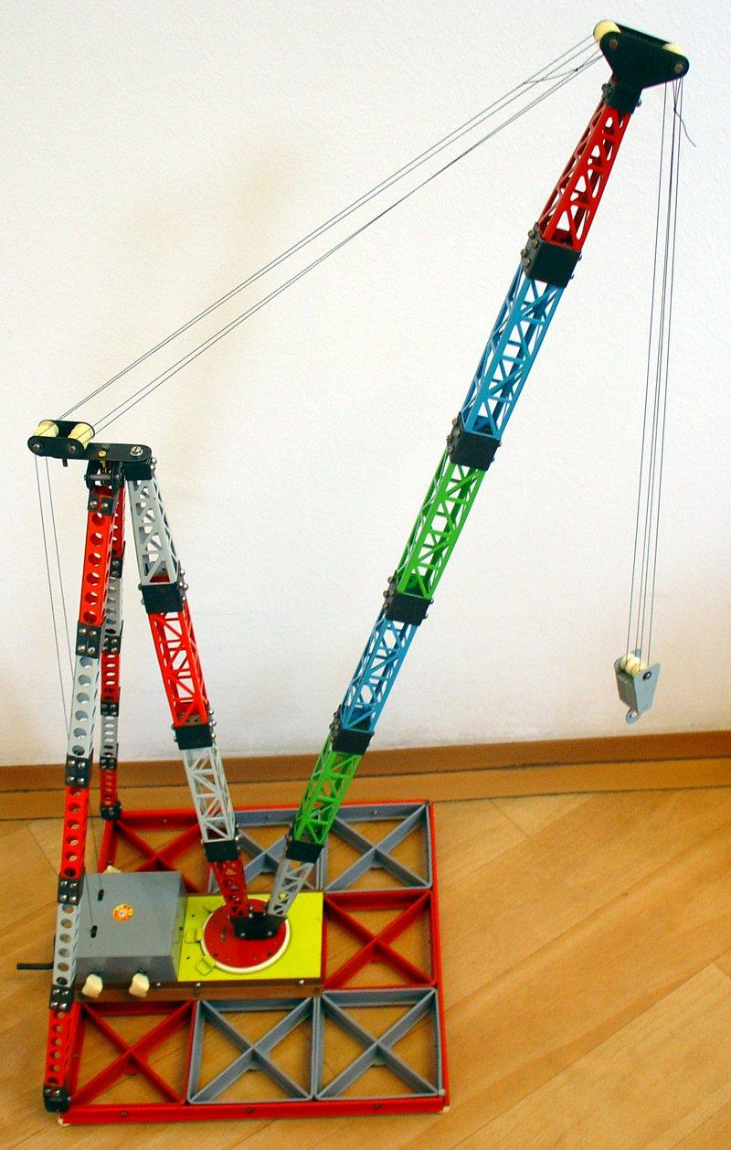 Hračka byla na ruční pohon kličkou a oproti jiným podobným, které měly pro každý pohyb zvláštní kličku, tato byla vybavena poměrně komplikovanou převodovou skříní, v níž bylo možno zařadit požadovaný pohyb na jedinou pohonnou hřídelku s kličkou. Pohyby byly tři: zvedání břemene, sklon ramene a otáčení jeřábu kolem svislé osy. Proto jsou v převodové skříni dvě hřídelky s navíjecími bubny na provázky a jedna k zařazení volného kuželového kola s pastorkem pro otáčení plotny, na níž se stavěly jednotlivé druhy jeřábů. Stavebnice obsahuje opravdu úctyhodné množství součástek. Několik jich však chybí: dvě hřídelky pro pohony (jsou již doplněny z jiné stavebnice), zarážka pro fixaci vzájemné polohy ramen, spojnice. Asi padesát samořezných šroubků s půlkulovou hlavou velikosti 2,6 x 6 mm jsem již také doplnil z jiné stavebnice.