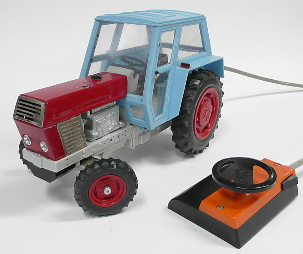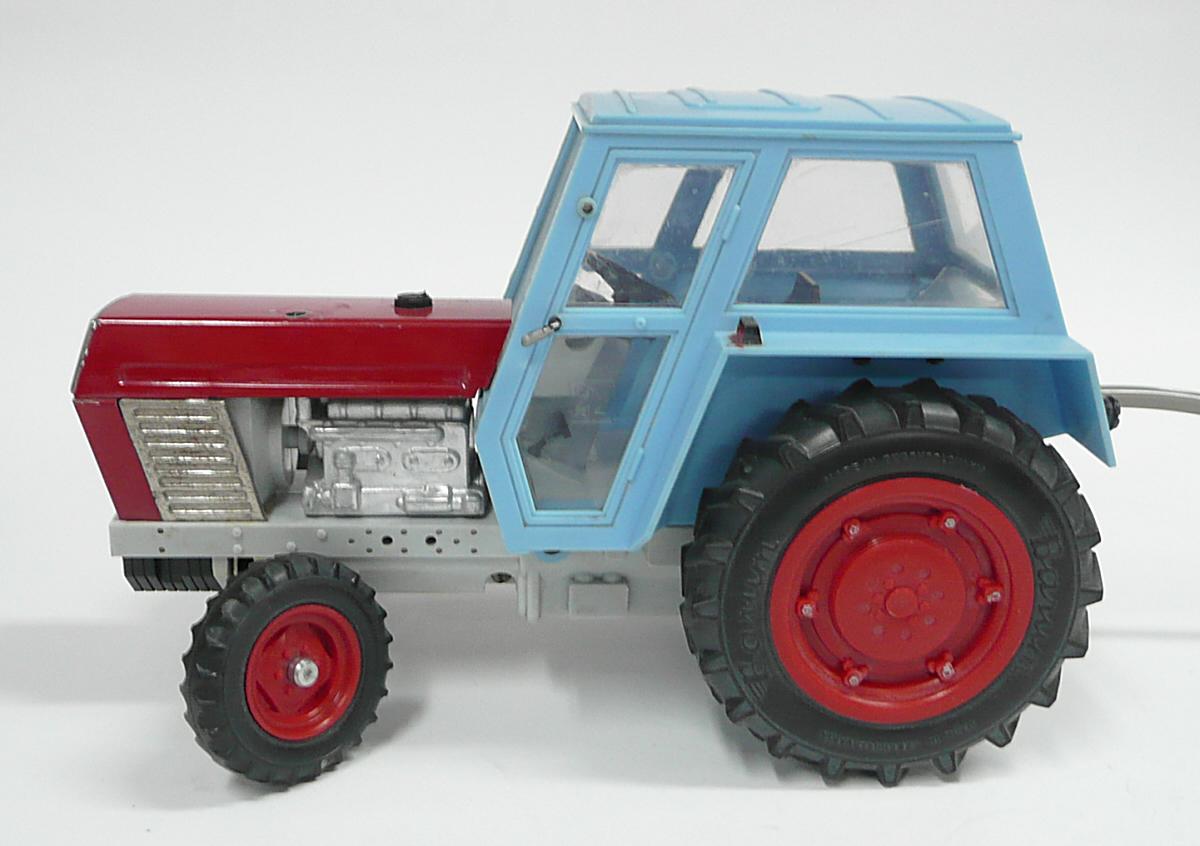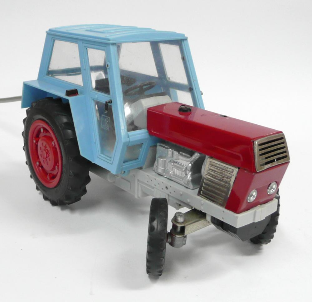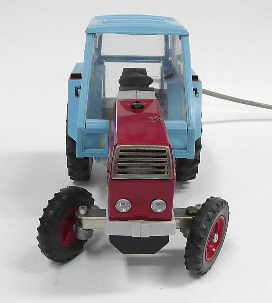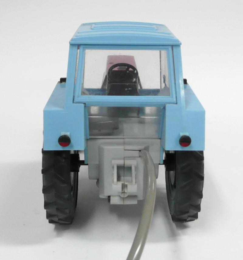 Elektromotorek na 4.5 V. Uvedený exemplář není úplný. Chybějí mu některé choulostivé detaily, které zpravidla při hraní vezmou za své: zpětná zrcátka (velmi choulostivá díky uchycení v horní části kabiny pomocí plastového dříku o průměru asi 2 mm!), tlumič výfuku na horní kapotě upevněný do otvoru průměru 3,5 mm opět plastovým dříkem, třmenové spřáhlo na připojení vleku vyrobené jako jeden kus z plastu včetně kolíku, které bylo sice výkyvné ve svislém směru, ale nebylo otočné kolem své osy, takže při připojení valníku bylo v nerovném terénu silně namáháno na krut v místě vetknutí tvaru T (horní příčka písmene představuje osu, která zajišťovala kývání spřáhla ve svislém směru, na svislé příčce písmene T byl uchycen třmen spřáhla), což zpravidla nevydrželo. Zde chybí i spodní díl ovladače, který se vyznačoval tím, že díky pákovému převodu u řízení přední nápravy musel u něj být použit jiný hřeben zapadající do ozubeného kola volantu - nelze tedy tento ovladač nahradit podobným z jiné hračky - traktor pak zatáčí na opačnou stranu než otáčíme volantem.