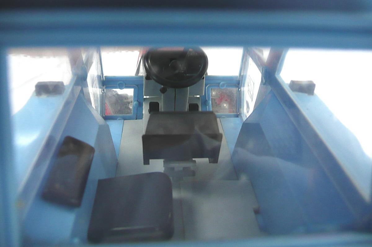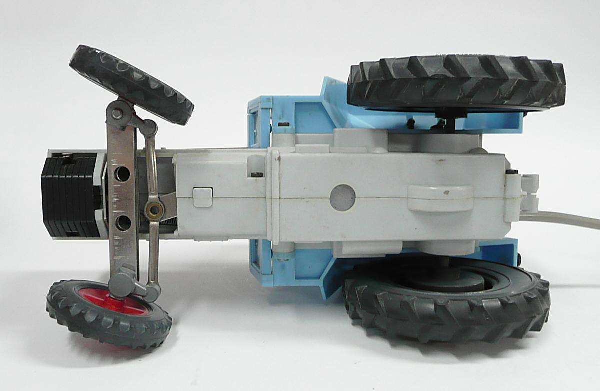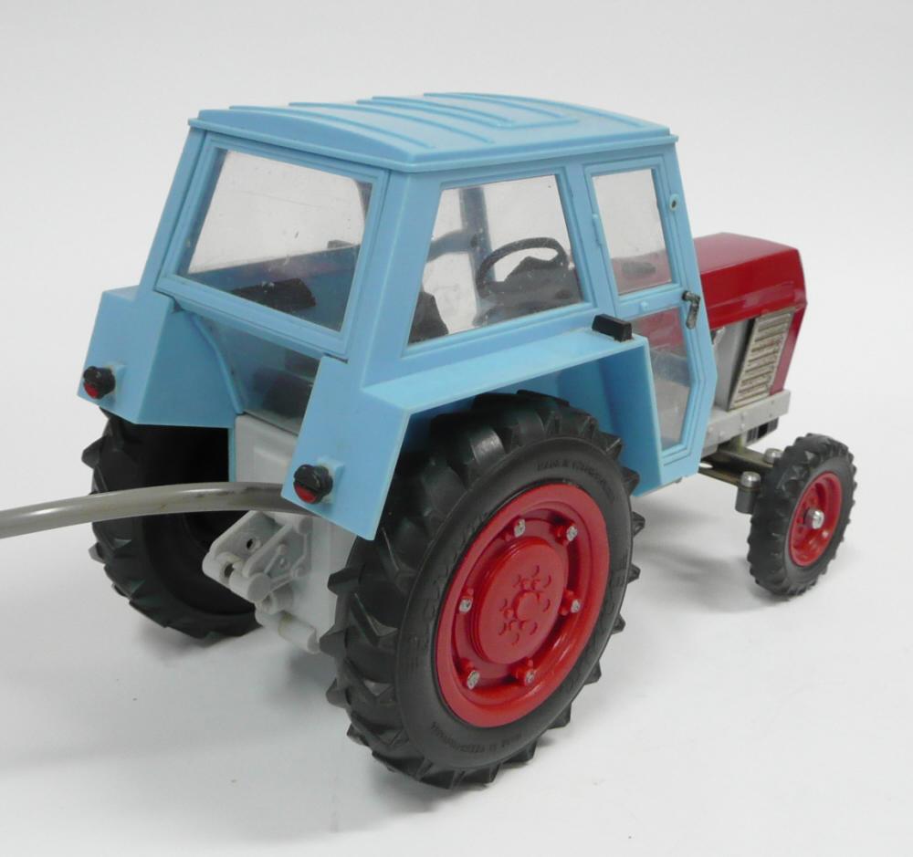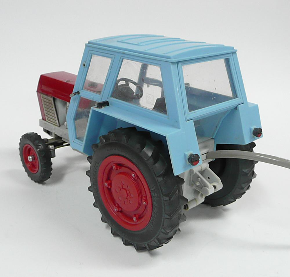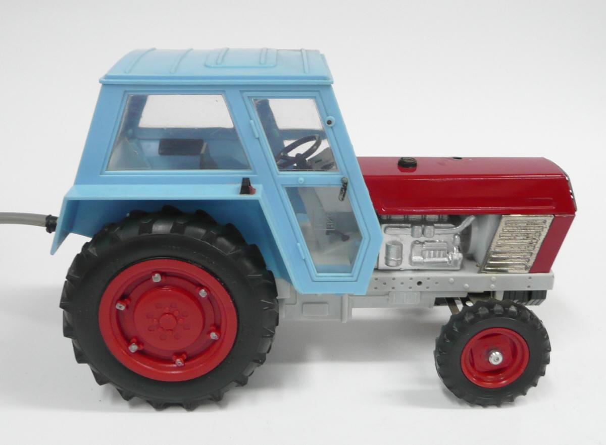 Elektromotorek na 4.5 V. Uvedený exemplář není úplný. Chybějí mu některé choulostivé detaily, které zpravidla při hraní vezmou za své: zpětná zrcátka (velmi choulostivá díky uchycení v horní části kabiny pomocí plastového dříku o průměru asi 2 mm!), tlumič výfuku na horní kapotě upevněný do otvoru průměru 3,5 mm opět plastovým dříkem, třmenové spřáhlo na připojení vleku vyrobené jako jeden kus z plastu včetně kolíku, které bylo sice výkyvné ve svislém směru, ale nebylo otočné kolem své osy, takže při připojení valníku bylo v nerovném terénu silně namáháno na krut v místě vetknutí tvaru T (horní příčka písmene představuje osu, která zajišťovala kývání spřáhla ve svislém směru, na svislé příčce písmene T byl uchycen třmen spřáhla), což zpravidla nevydrželo. Zde chybí i spodní díl ovladače, který se vyznačoval tím, že díky pákovému převodu u řízení přední nápravy musel u něj být použit jiný hřeben zapadající do ozubeného kola volantu - nelze tedy tento ovladač nahradit podobným z jiné hračky - traktor pak zatáčí na opačnou stranu než otáčíme volantem.