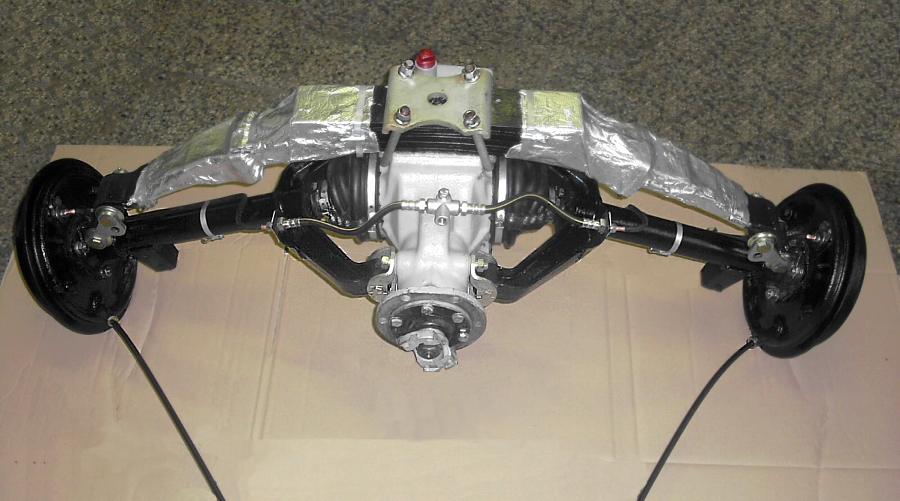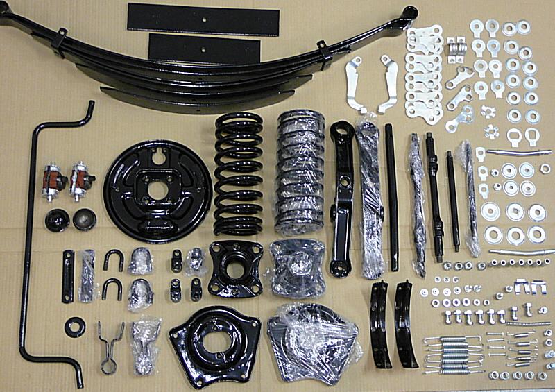 Náprava přední. Typ SPA-OCT-FEL-1200–2, ilustrační foto. Součástí jsou bubny, štíty, prasátka, spojovací i řídicí tyče – viz rozpis výše.