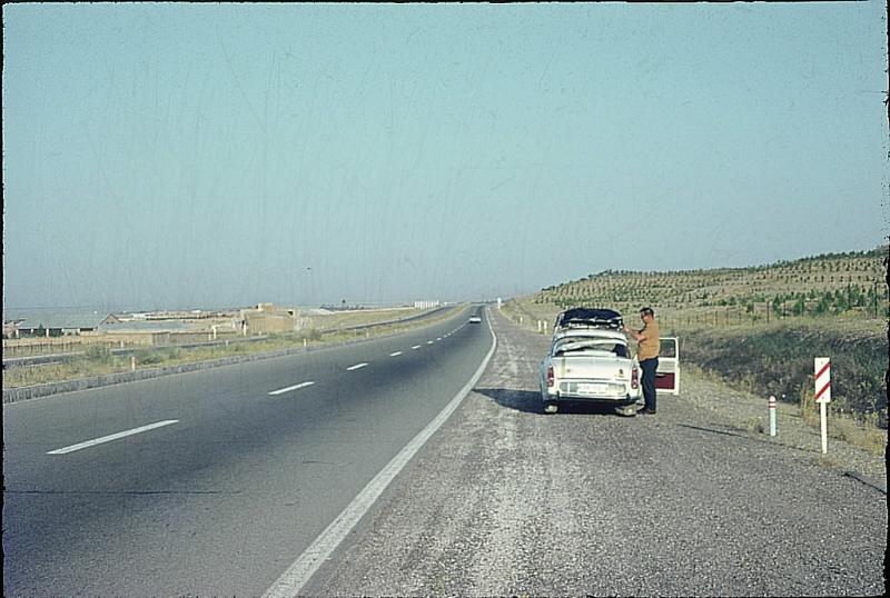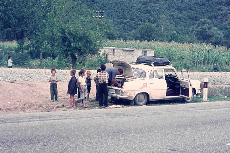 Nutno říci, že vůz zdolal dlouhou a nelehkou cestu ve vedrech, horách a prachu celkem bez problémů. Otec si vzpomíná jen na přetržený řemen větráku (viz foto, kde možná ještě v ruce drží nějakou hadici (?) možná spojitost s přehřátým motorem...). Komické je, že na většině fotek je zvednutá haubna a nad ní nahnutá hlava řidiče, takže se asi vzadu občas něco kutilo...