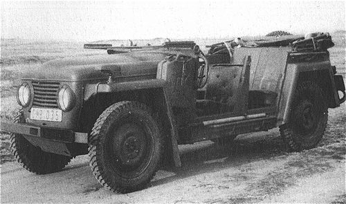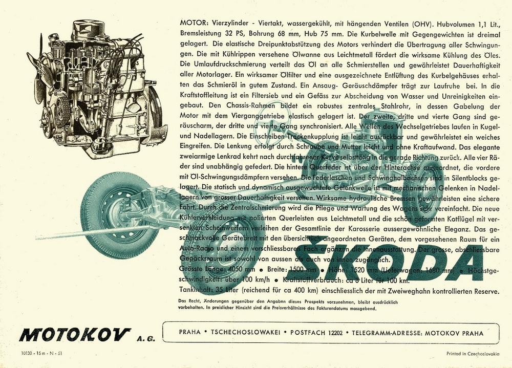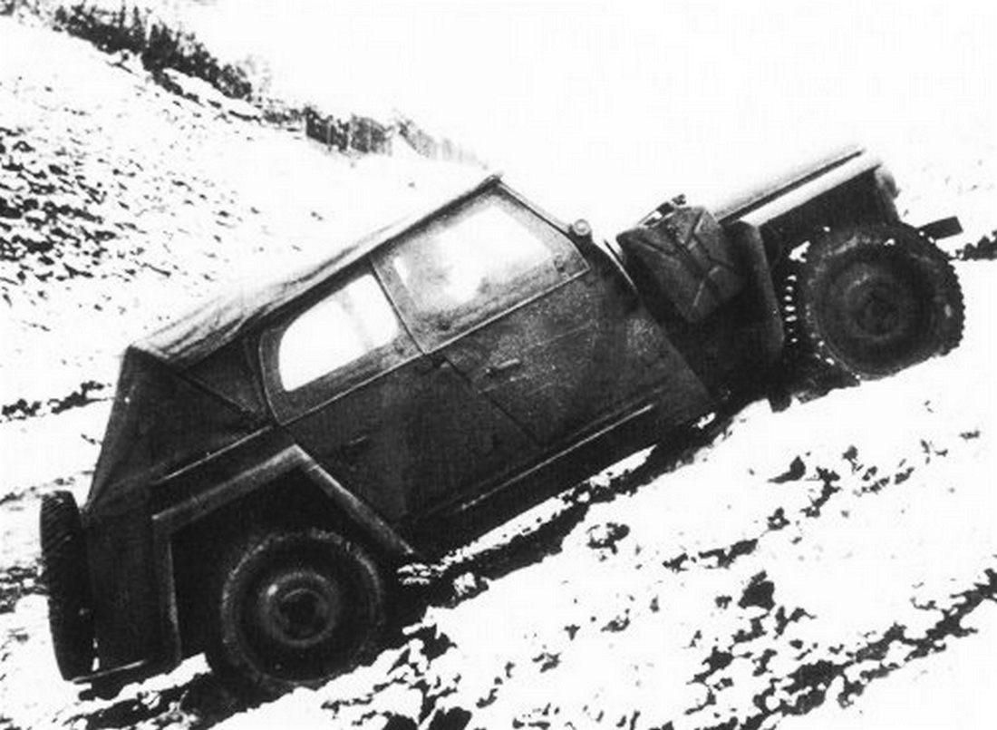 Prototyp Škoda 965. Čtyřdveřový čtyřmístný terénní vůz s motorem vpředu a pohonem všech čtyř kol (4×4). Zážehový, kapalinou chlazený řadový čtyřválec (R4), rozvod OHV, objem 1221 cm³, vrtání 72,0 mm, zdvih 75,0 mm, dva ventily na válec, karburátor Solex, bez přeplňování. Výkon 33 kW (45 koní) při 4200 ot/min. Mechanická čtyřstupňová převodovka s redukcí. Rozvor 2485 mm, rozchod kol 1300/1270 mm. Rozměry: délka 3580 mm, šířka 1700 mm, výška 1550 mm. Maximální rychlost 90 km/h.