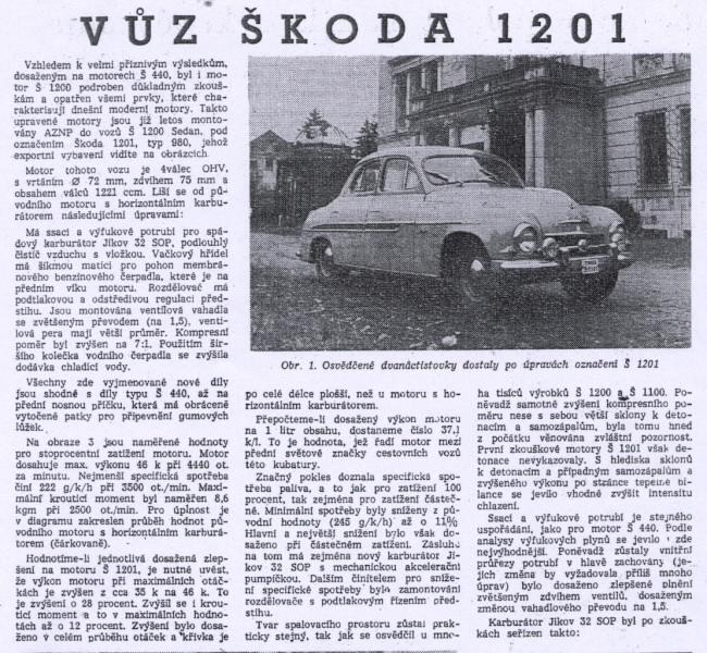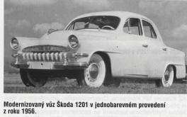 Dle dobového článku (viz níže) měl takto vypadat vůz 1201 modernizovaný v r.1956 pro export. Ve skutečnosti nakonec se do seriové výroby nedostal. Škoda, protože těmito skromnými vylepšeními - vpodstatě ozdůbkami se poněkud oteklý vůz (říkalo se, že na karoserii nenajdeš rovnou plochu) proměnil v slušnou evropskou limuzínu. Ale doba musela být opravdu bídná, že ani toto neprošlo.