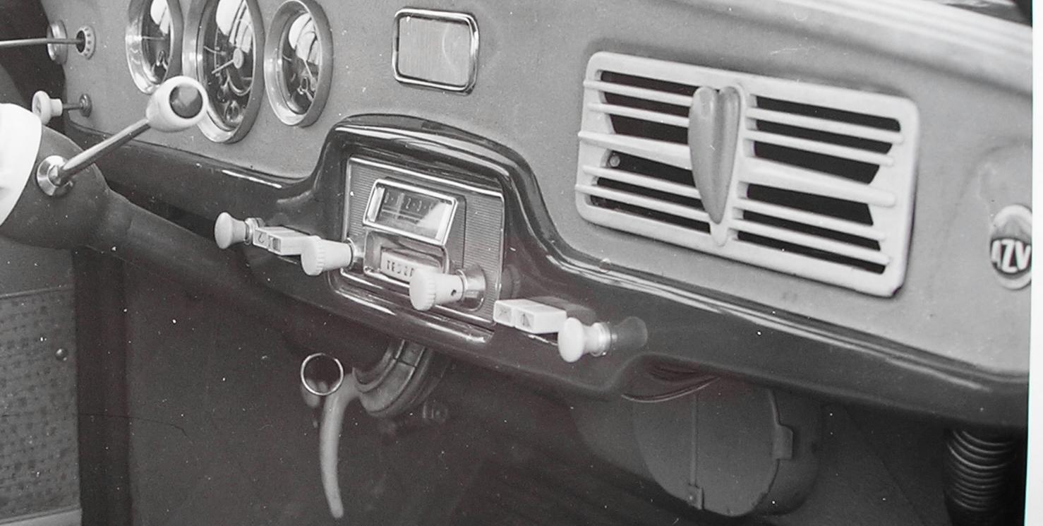 Na tomto detailu z větší fotografie vypadá přístrojovka odlišně – její horní hrana je vodorovná, nikoli vydutá jako na fotu interiéru.