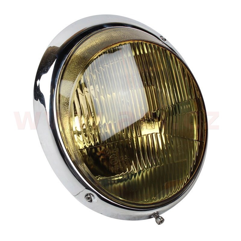 Přední světlo H4 se žlutým sklem a chromovým rámečkem komplet L=P r.v. 69-83