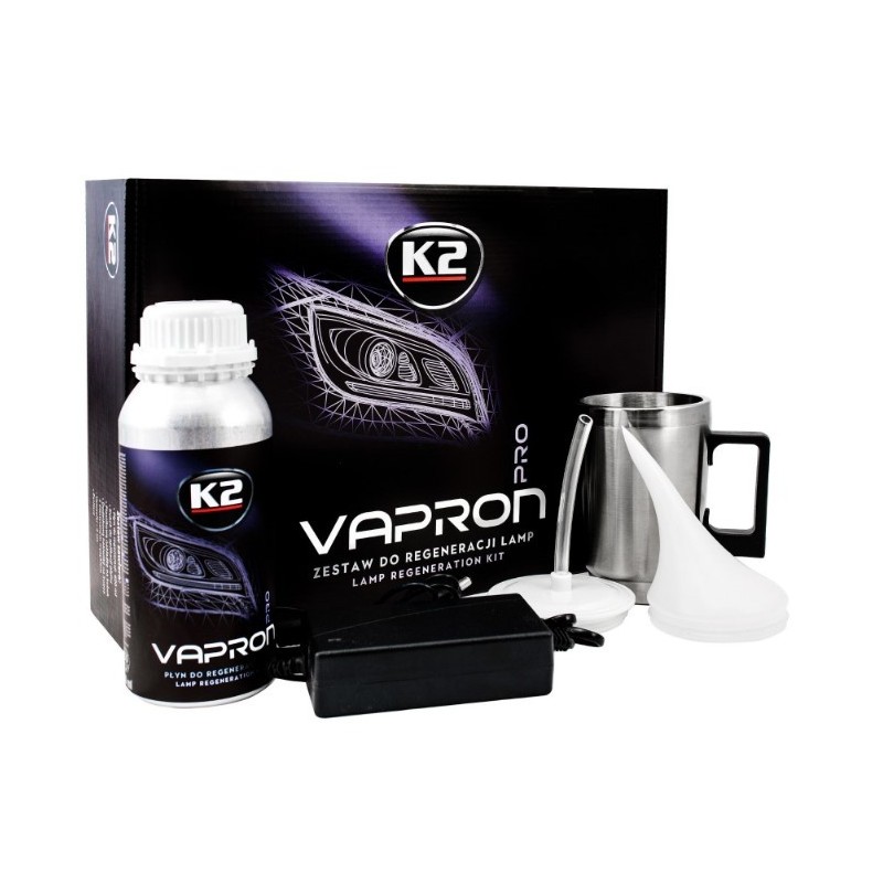 Sada K2 Vapron odstraňuje škrábance, zabarvení a matování. Tekutý polykarbonát se zahřeje ve speciální „konvici“ (hrnku) a poté se jeho páry nanášejí na poškozený povrch. Takto regenerované lampy získávají svůj původní vzhled.